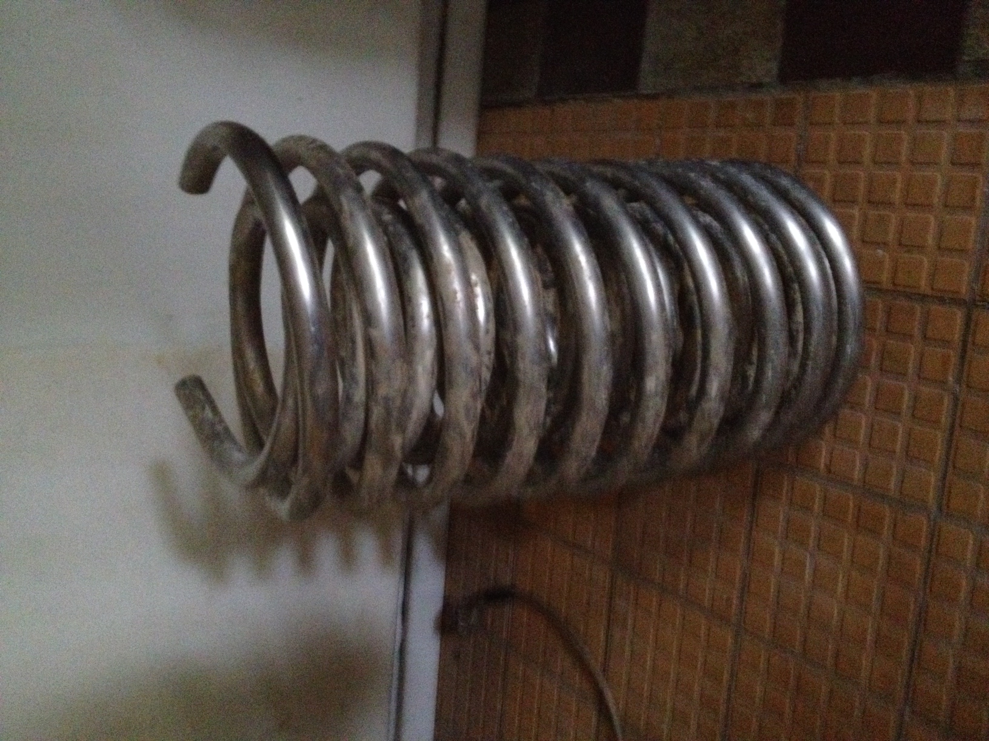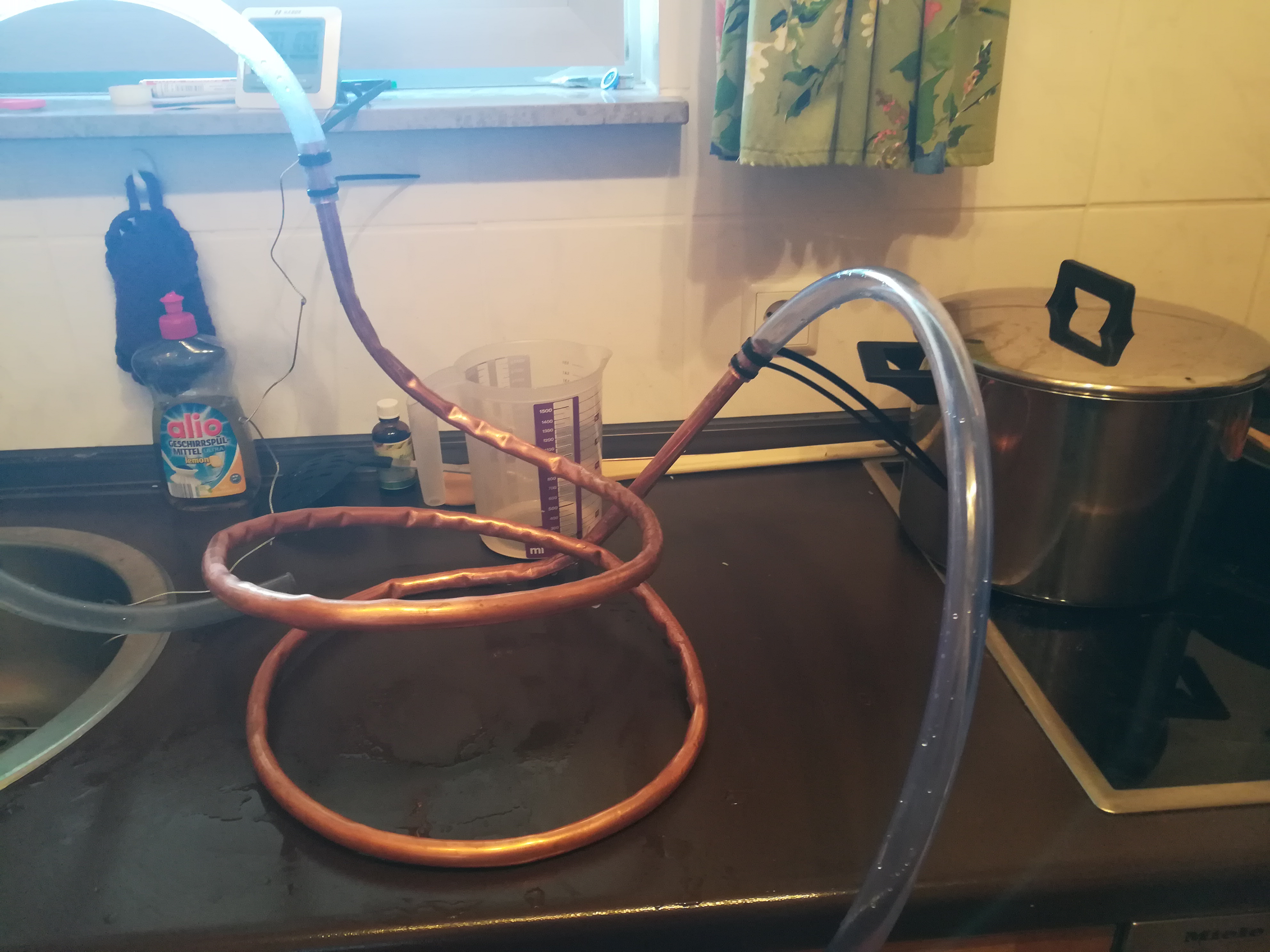 Wahrscheinlich hat der TE eine harte Kupferstange genommen. Daher auch die Knicke und das Rumgefrickel mit dem Sand. Besser wäre weiches Kupfer von der Rolle gewesen, und auch gleich etwas mehr. Das kann einfach ohne Sand und andere Hilfsnmittel z.B. um einen stabilen Topf gebogen werden. 2,5 m halte ich auch für viel zu wenig. Wem das Kupfer zu teuer ist, der kann auch preiswerteres Edelstahlwellrohr nehmen. Oder den oben verlinkten fertigen Kühler.