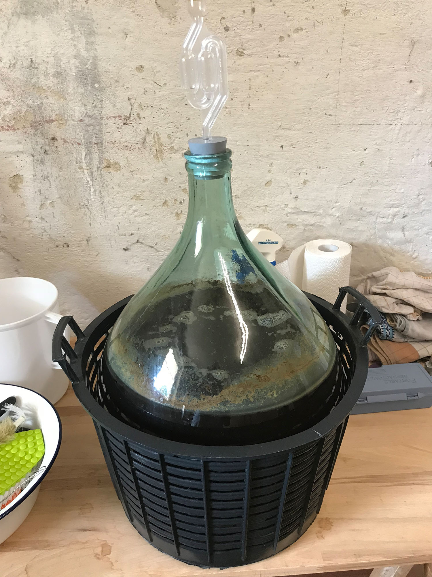 Gärbehälter aus Glas und nicht aus Kunststoff um Acteobacter nicht zuviel Sauerstoff zu geben.