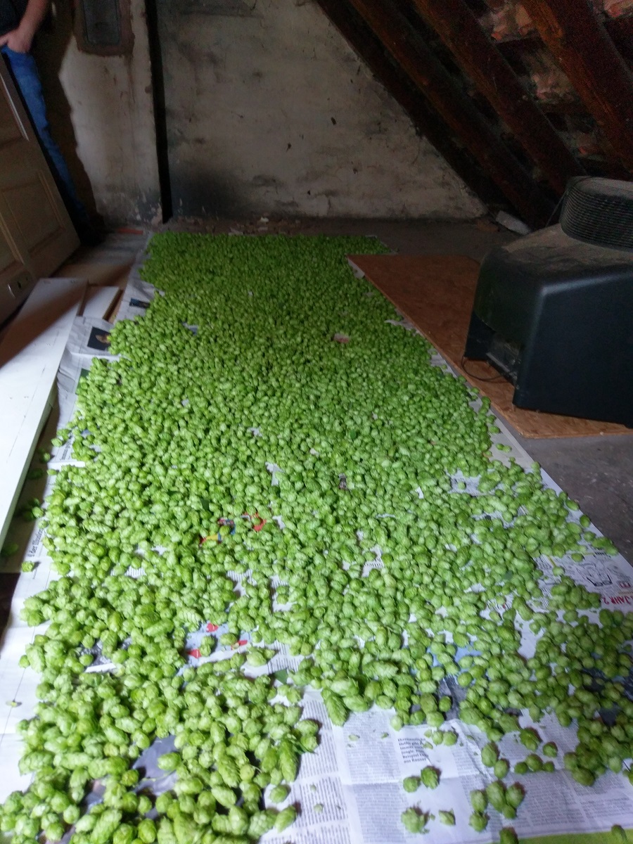 Jetzt trocknet der Hopfen in Ermangelung anderer Möglichkeiten schön am Dachboden dahin und wird alle paar Stunden von mir gewendet.