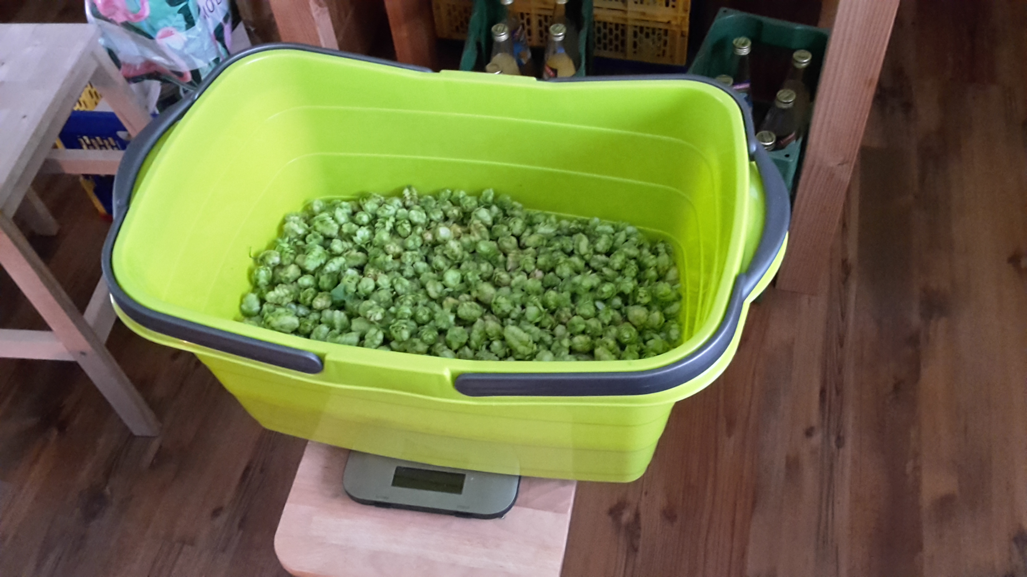 Durch den späten Frost diese Jahr hab ich leider einen Trieb verloren. Trotzdem noch 700g Grünhopfen von den verbliebenen zwei Trieben gezupft.