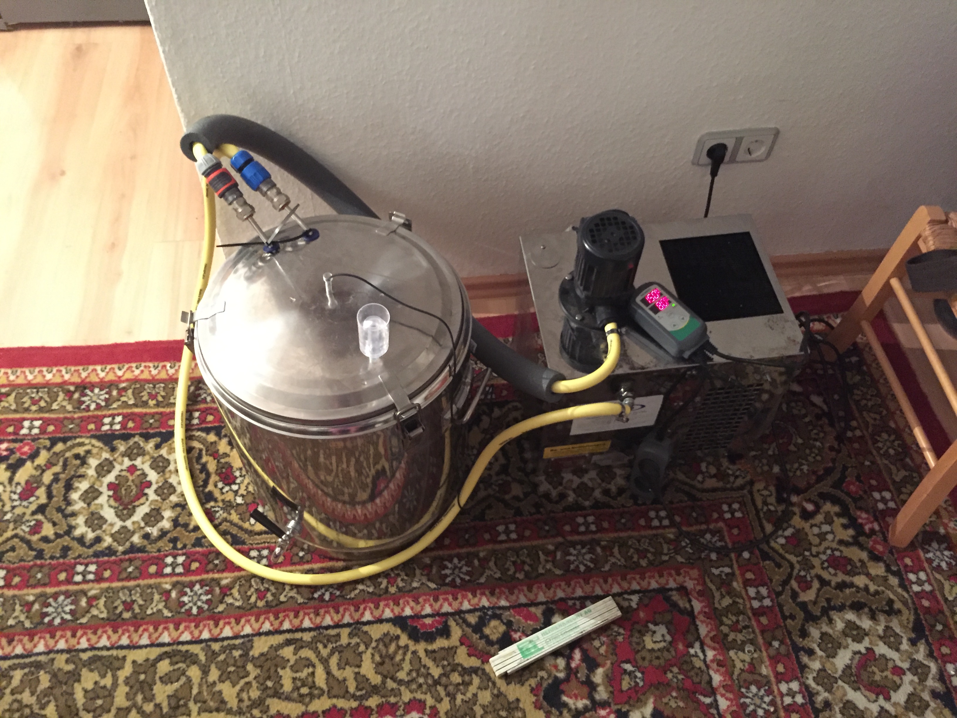 So ich habe gerade meinen ersten Versuch mit der Anlage am laufen. Im Vorfeld habe ich alles ein mal mit Wasser ausprobiert und es hat super geklappt. Als ich jedoch den ersten richtigen Versuch gewagt habe ist gleich was schief gelaufen: das inkbird ist beim runterkühlen irgendwie bei 10,4°(10° war zieltemperatur, Hefe 34/70), also nur das Thermometer, stehen geblieben und hat immer weiter runterkühlen lassen. Da die Temperatur vorher immer sehr rasch gefallen ist und mir das ganze nicht geheuer war, habe ich kurz den temperaturfühler raus geholt und wieder reingesteckt. Plötzlich ist auch die Temperatur gesunken, der Begleitkühler ist ausgegangen aber da war es schon viel kälter da drinnen. Es waren schon 6°. Leider war da die Hefe schon drinnen, da ich sie bei 10,4 reingegeben habe.