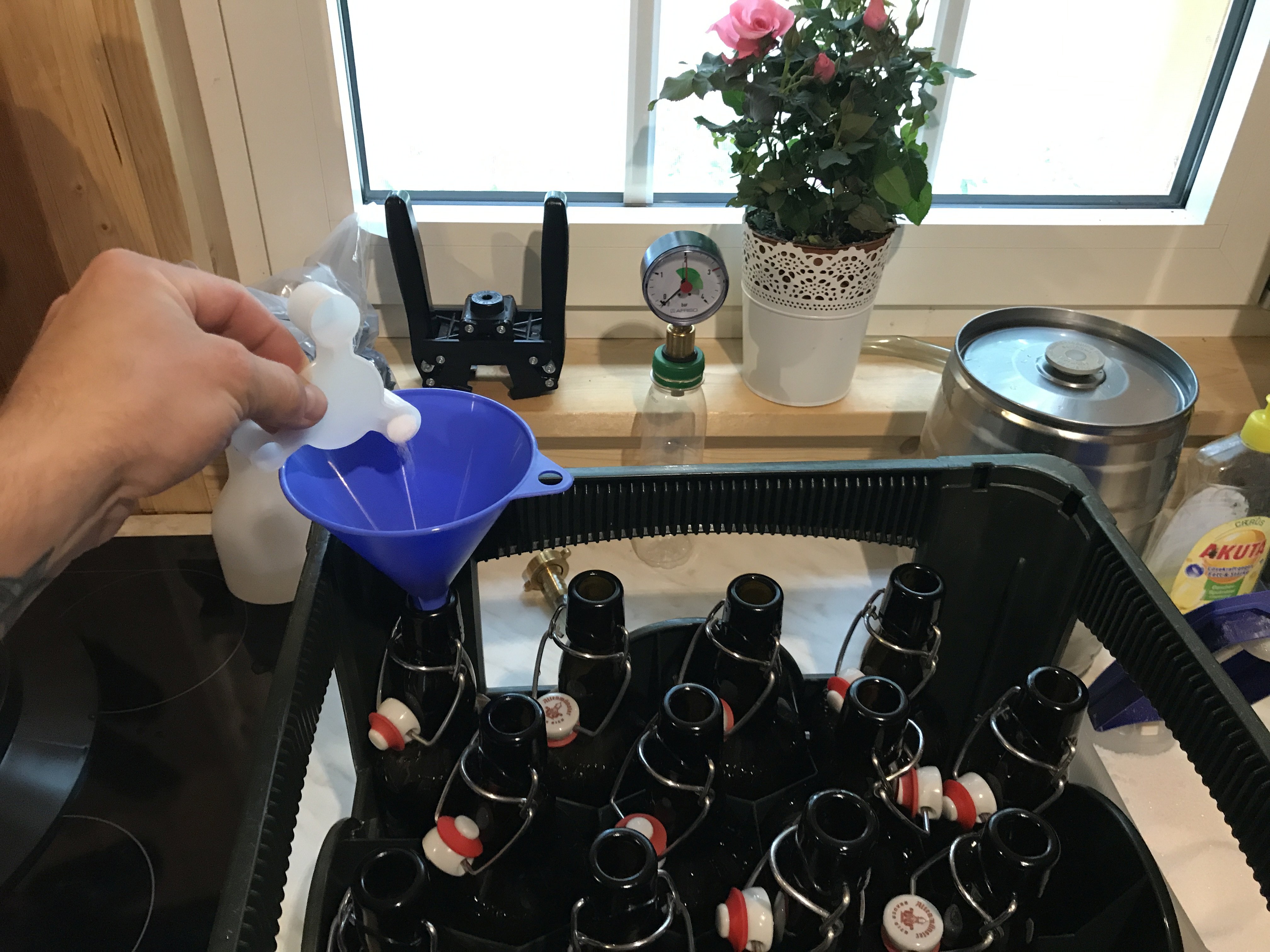 Als erstes das Mundstück mit Iso eingesprüht und anschließend Flaschen heiß von innen und außen abwaschen. Dann das ganze noch einmal vernünftig blasten... erst dann bin ich zufrieden... Nun alles auf dem Flaschenbaum plaziert zum abtropfen. Ein kurzer Blick in den Gäreimer sagt es ist noch etwas Zeit... Also fange ich an mit Zucker vorlegen mit der bekannten Messeinheit.