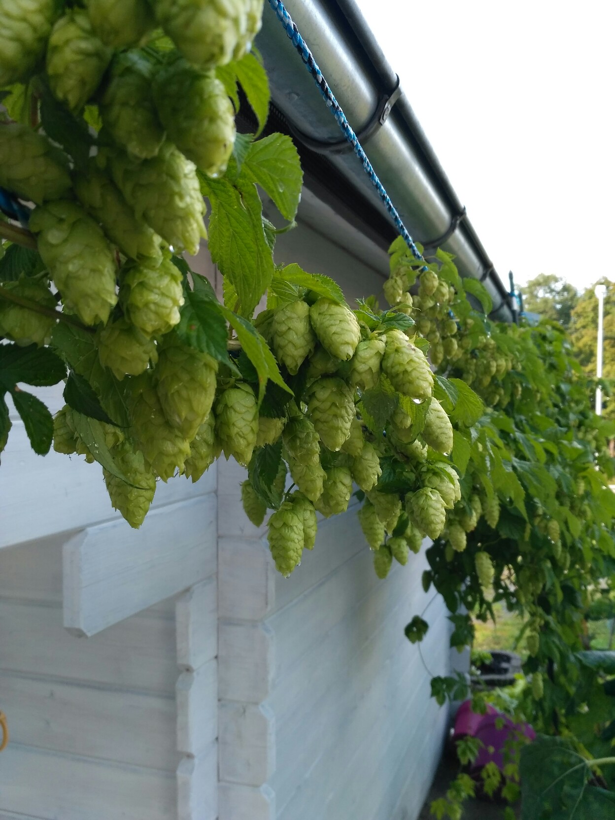 Durch den späten Frost diese Jahr hab ich leider einen Trieb verloren. Trotzdem noch 700g Grünhopfen von den verbliebenen zwei Trieben gezupft.