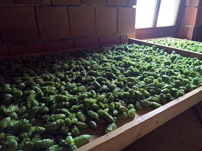 Jetzt trocknet der Hopfen in Ermangelung anderer Möglichkeiten schön am Dachboden dahin und wird alle paar Stunden von mir gewendet.