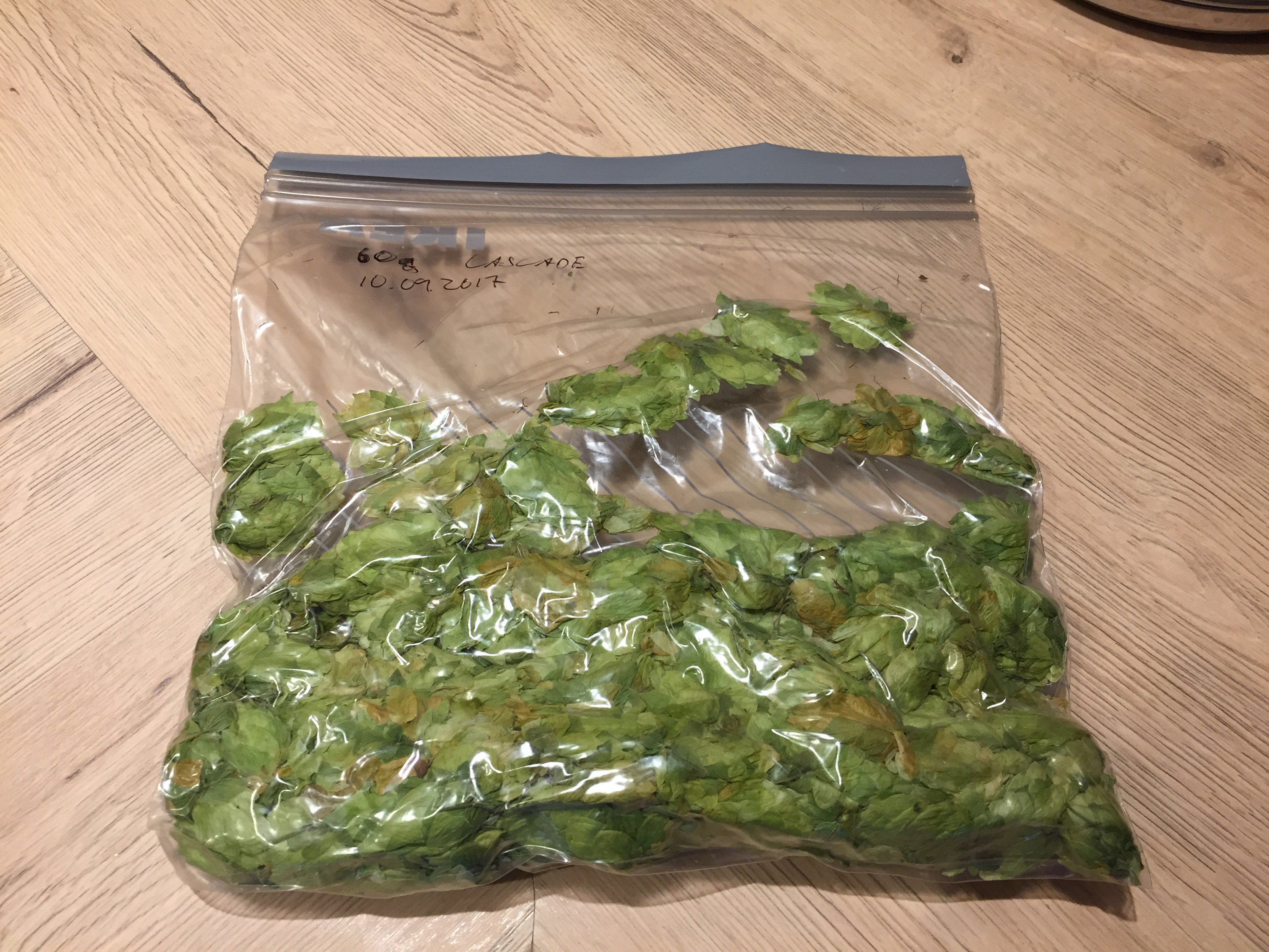 Meine Ernte des im Mai neu angepflanzten Cascade: immerhin 60g getrocknet. Der Saphir hat im ersten Jahr noch nichts getragen.