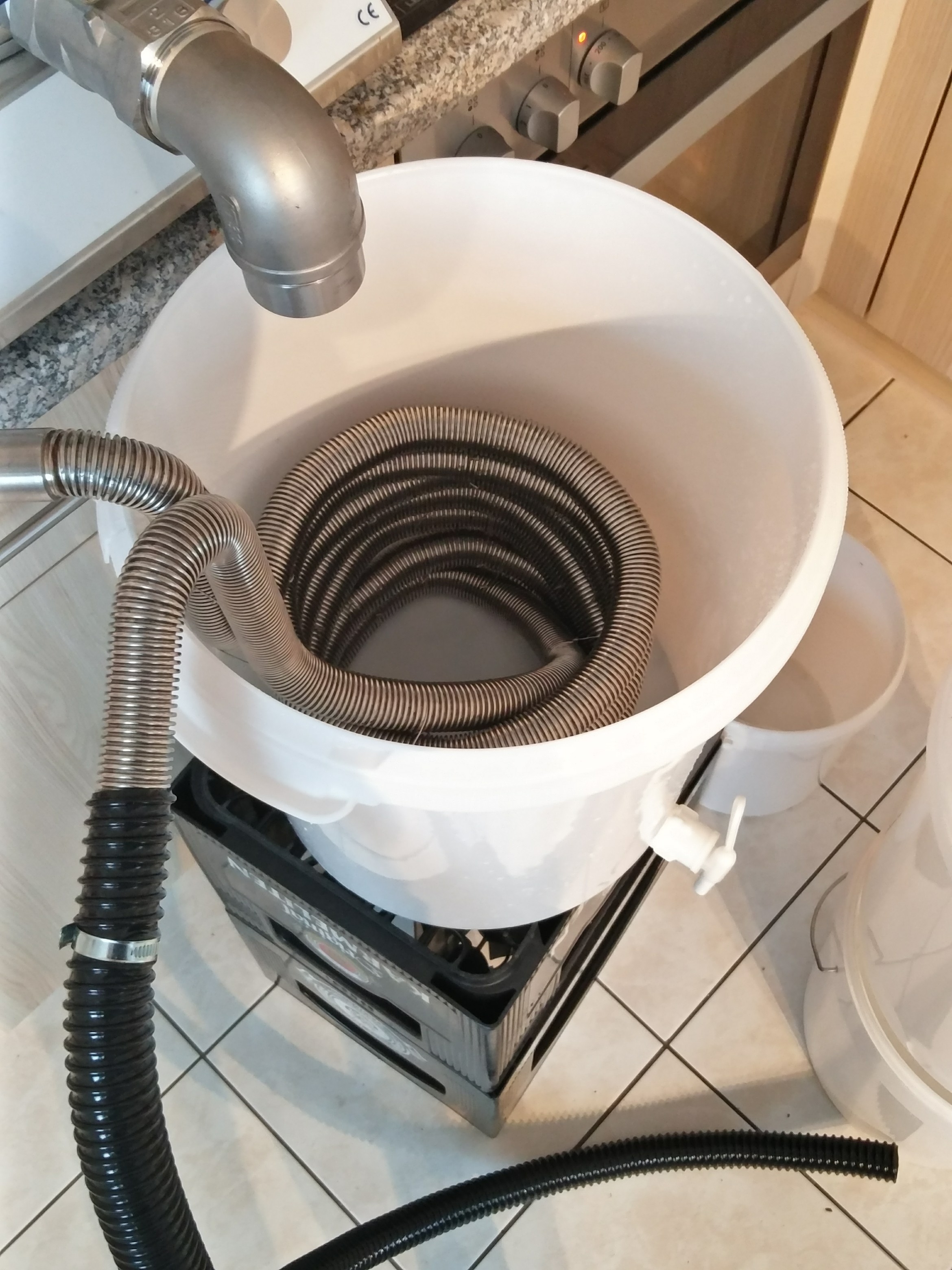 Ich komme zum Schluss, dass für mich vermutlich ein spiralförmiger Gegenstromkühler die beste Option gewesen wäre. Die sind effizient und haben auf der Innenseite eine glatte Wand, welche mittels Durchfluss sicher sehr einfach zu reinigen ist. Leider gibt es die mit einer genügenden Leistung für 100 Liter und mehr nicht zu kaufen - oder?