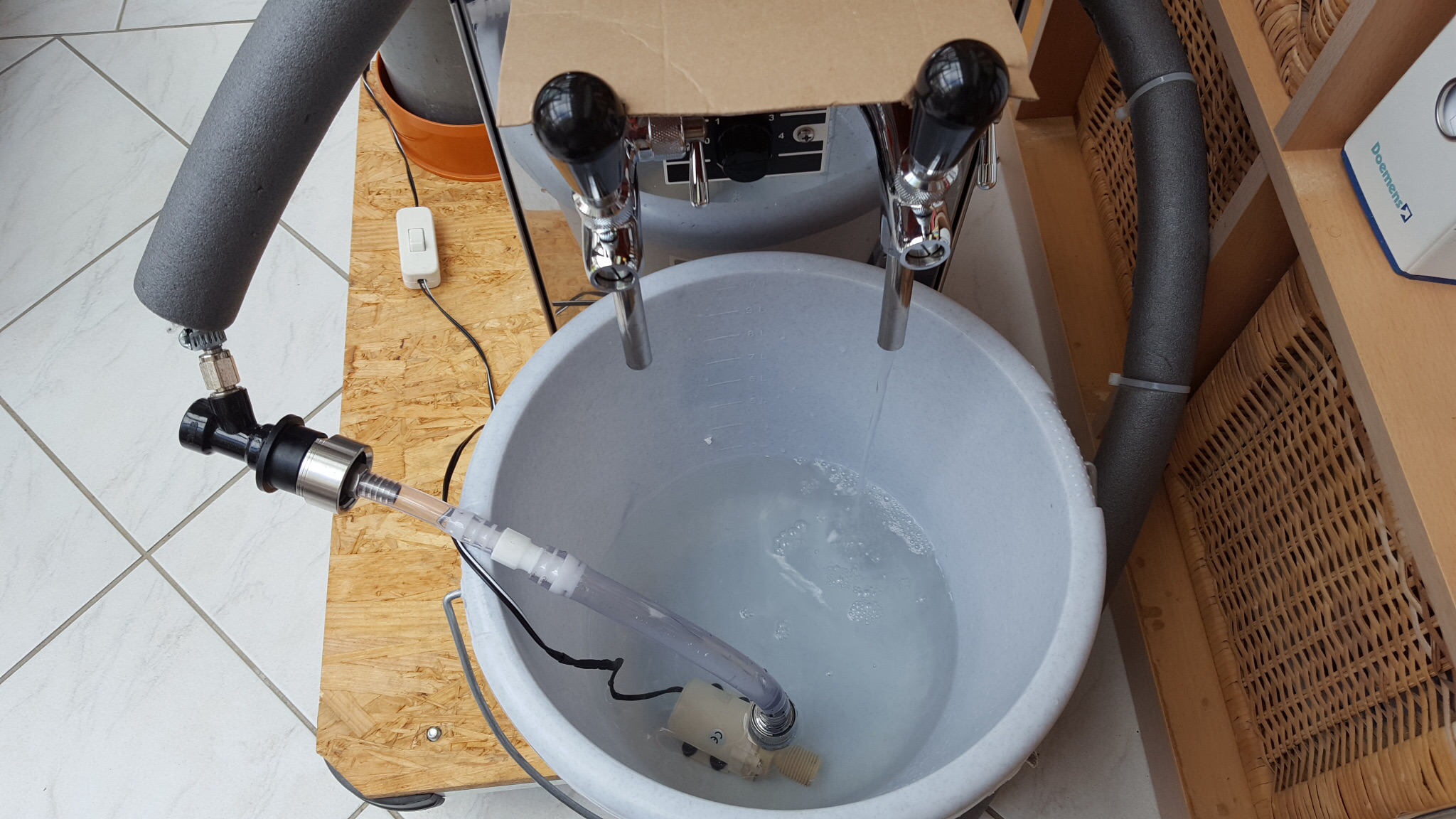 Sollten beide Hähne und Kühlwege gereinigt werden, verbinde ich die beiden Zapfhähne mit einem Silikonschlauch und spüle über den zweiten Anschlussschlauch retour in den Eimer.