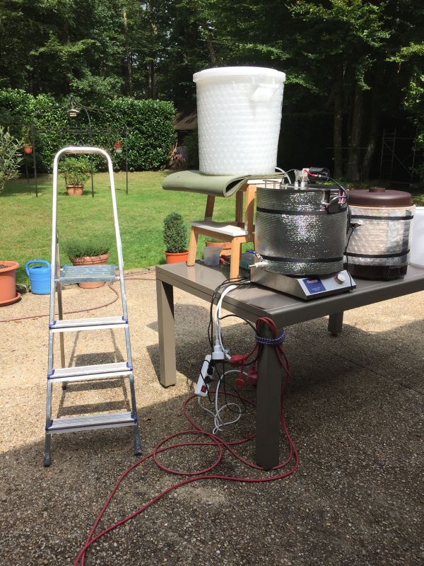 Derzeit Gäreimer bereitstellen und Filter anbringen. Schlauch liegt auf dem Boden vom Gärfass.
