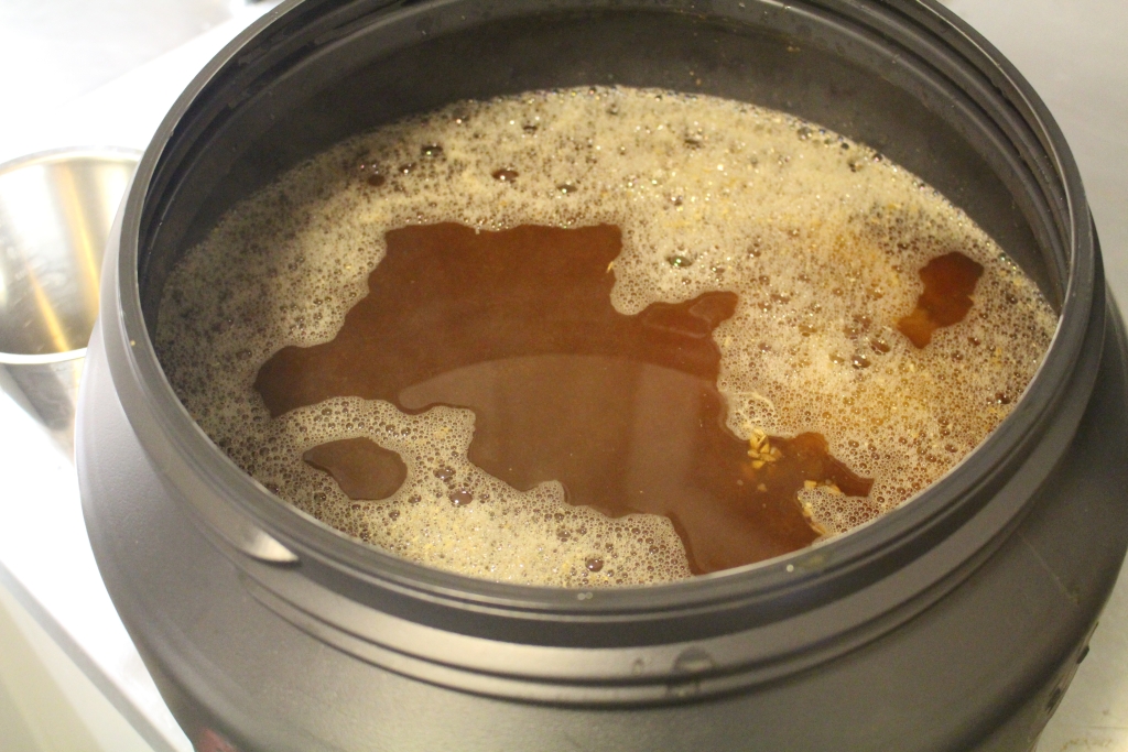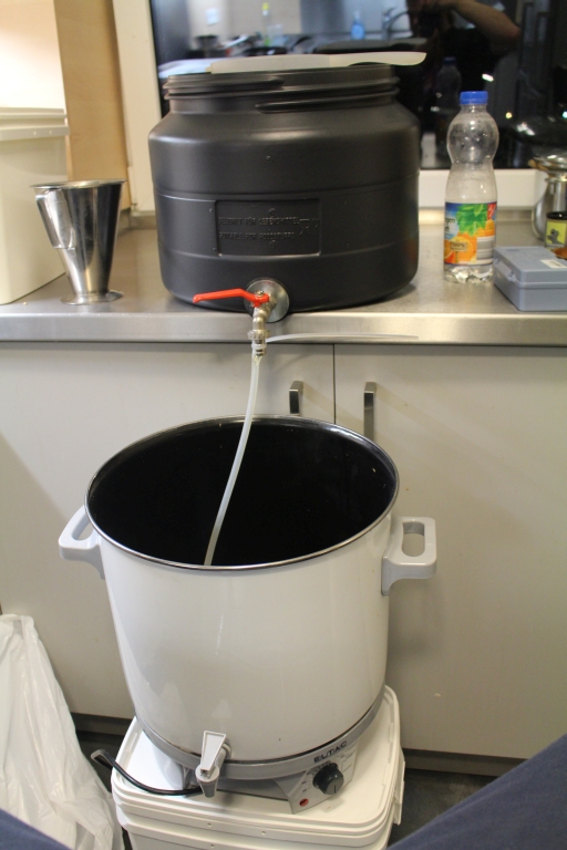 Läutern: Der neue Läuterbottich wurde eingeweiht. Nach dem alles übergeschöpft war, hielt ich 15 Minuten Läuterruhe. Danach ließ ich 4 mal vorschießen. Die ersten 4 Liter wanderten wieder zurück in den Läuterbottich, dann war ich schon halbwegs zufrieden mit der Farbe, nach einem weiteren Liter wurde langsam aber stetig abgelassen in den Einkochtopf, den ich in der Zwischenzeit gesäubert hatte.