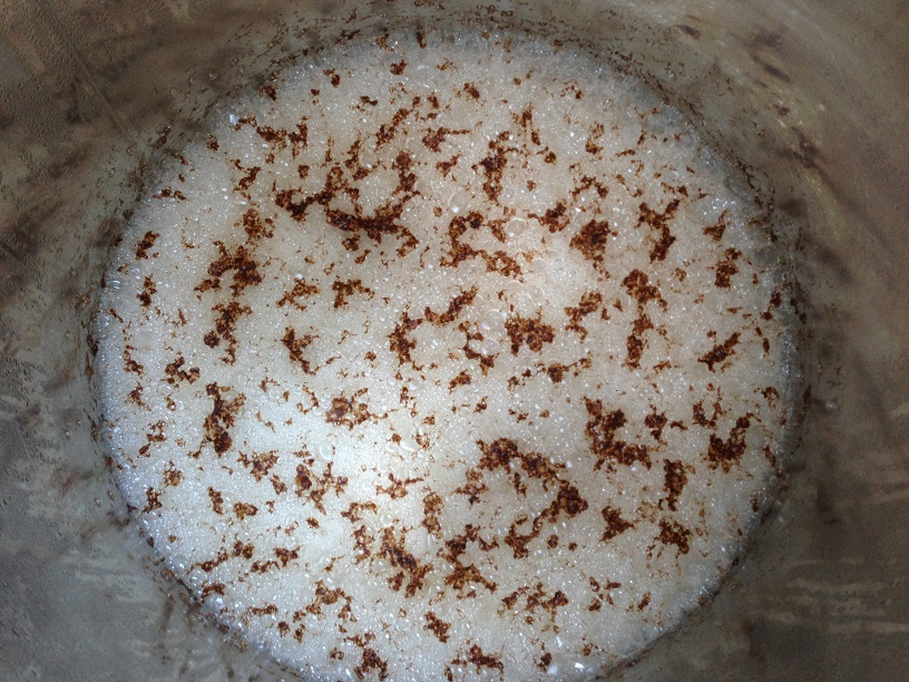 Eine kurze Prüfung der Würze ergab das Ergebnis von 23 Brix, da muss also noch einiges geläutert werden. 16,5°P brauche ich, dann geh ich sicherheitshalber mal nur auf 15 Brix runter. So wurde es gemacht, und am Ende hatten wir 43l im Kessel. Im Läuterbottich war immer noch einiges an Nachguss drin. Das war bei mir noch nie so, und daher überlegte ich, was damit machen? Habe dann einfach mal insgesamt 5L rauslassen, und dachte mir, das eignet sich gut für Hefenvermehrung oder hinterher zum verdünnen.