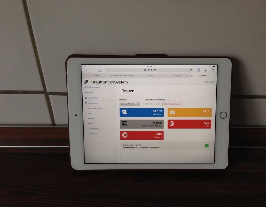 So denn, das Rezept vom Brauhelfer in das BrauKontrollSystem importiert und die Anlage aufgebaut. Erschreckenderweise, habe ich vergessen die Einmaischtemperatur anzugeben, weswegen ich entschied manuell den Topf solange an zulassen, bis die 45° Einmaischtemperatur erreicht sind, um dann dann mittels BKS die Rasten weiterhin automatisch zu fahren. Habe 47° erreicht, und dachte durch die Schüttung dürfte es gut auf ca 45° kommen. Da die Hitze ja nach nachläuft, waren dann aber schneller als mir lieb war 50° trotz Einmaischen auf dem Display, und es wollte nicht runtergehen. Entschied mich dann, dies als 1. Rast statt den 45° zu nehmen. Macht nix, ist auch ok. Unter den metallischen Klängen der neuen Eisbrecher CD entspannten wir uns erstmal.