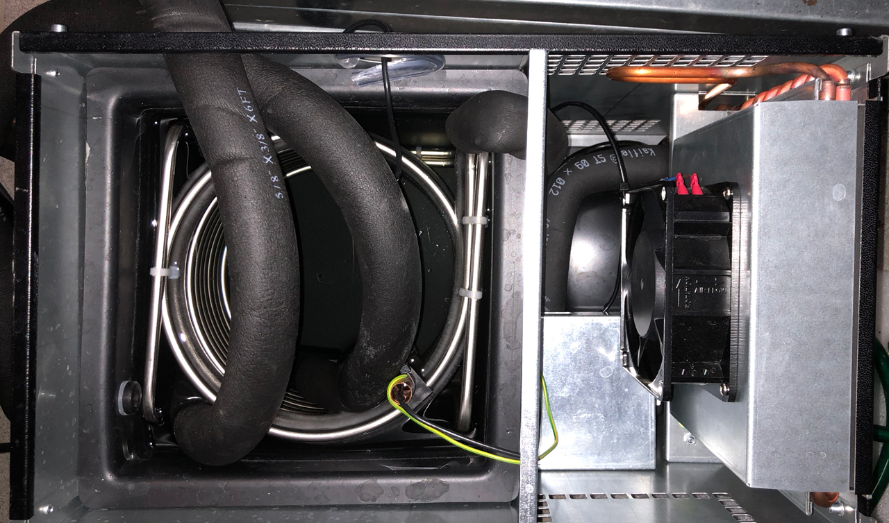 Geliefert wird dieser mit zwei Kühlschleifen die ineinander liegen. Sie sind nur in den Wasserbehälter hineingelegt, so dass man sie problemlos entfernen kann. Mit dabei ist auch eine Pumpe (230V). Diese ist dazu gedacht beim Zapfbetrieb kaltes Wasser parallel zur Bierleitung zirkulieren zu lassen. Die Pumpe läuft im Dauerbetrieb, sobald man das Aggregat einschaltet. Da ich die Pumpe nicht benötige, habe ich sie auch ausgebaut (sie ist ebenfalls nur hineingelegt).