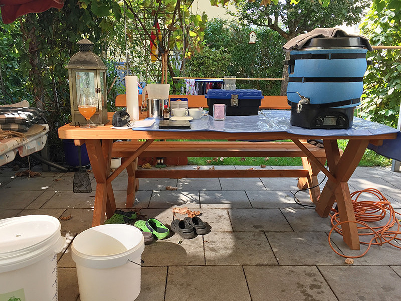 Alles in allem war es ein sehr schöner Brautag bei herbstlich sonnigem Wetter. Ich hatte eigentlich etwas Bedenken vor dem Läutern (mußte das letzte Mal immer den Treber aufschneiden), aber dass ging bis zum Ende völlig geschmeidig (wie die Nachgüsse oben drauf gingen, kam Würze unten raus), obwohl mir der Treber mal kurz trocken gelaufen war.