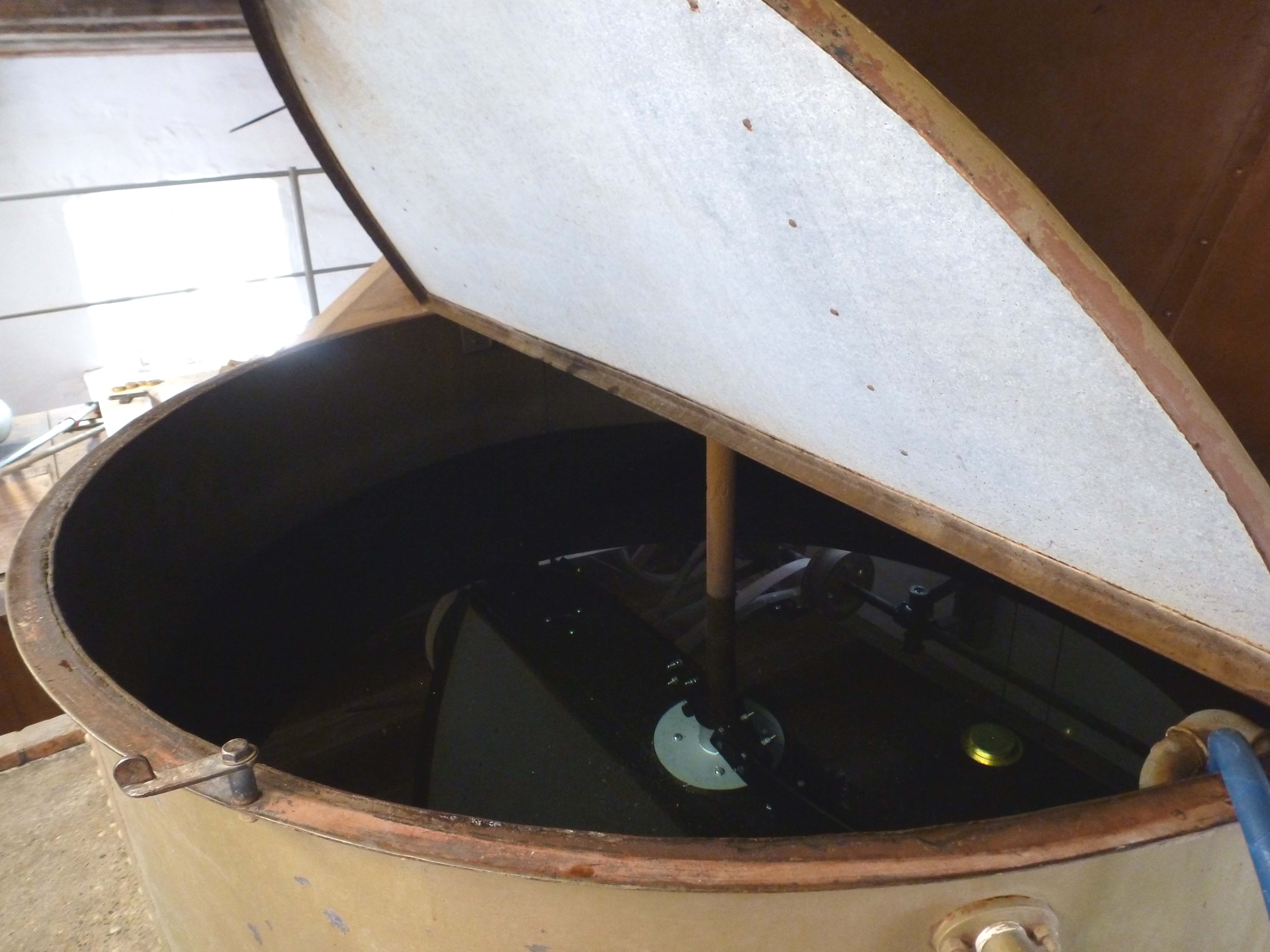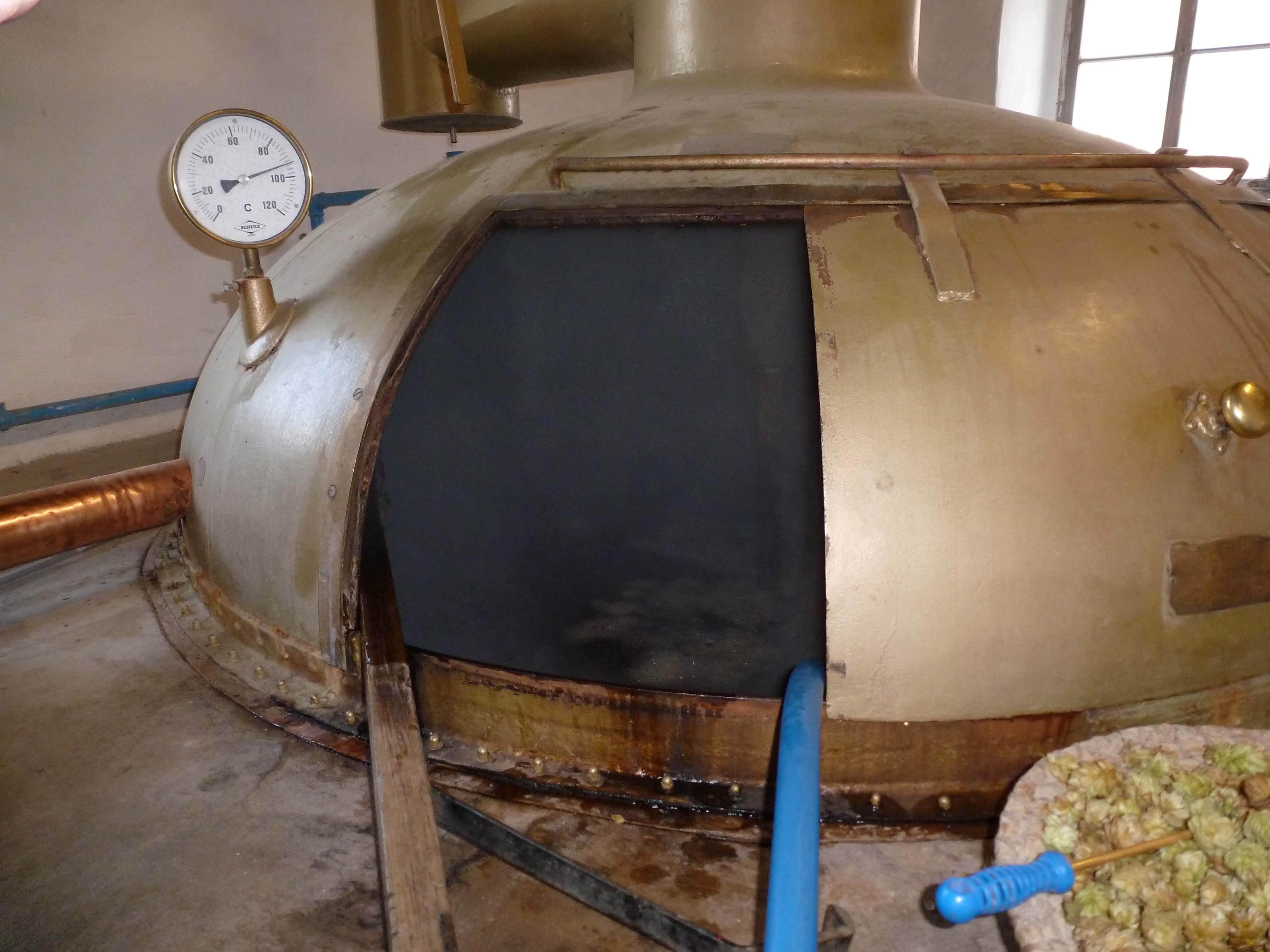 Alles in der historischen Braustätte ist noch komplette Handarbeit. Nur die Pumpe ist das einzige moderne Eingeständnis. Die Malzquetsche ganz oben in der Brauerei wird noch mit Riemen angetrieben und der Maischebottich, sowie der Würzekessel mit Holzfeuer beheizt.