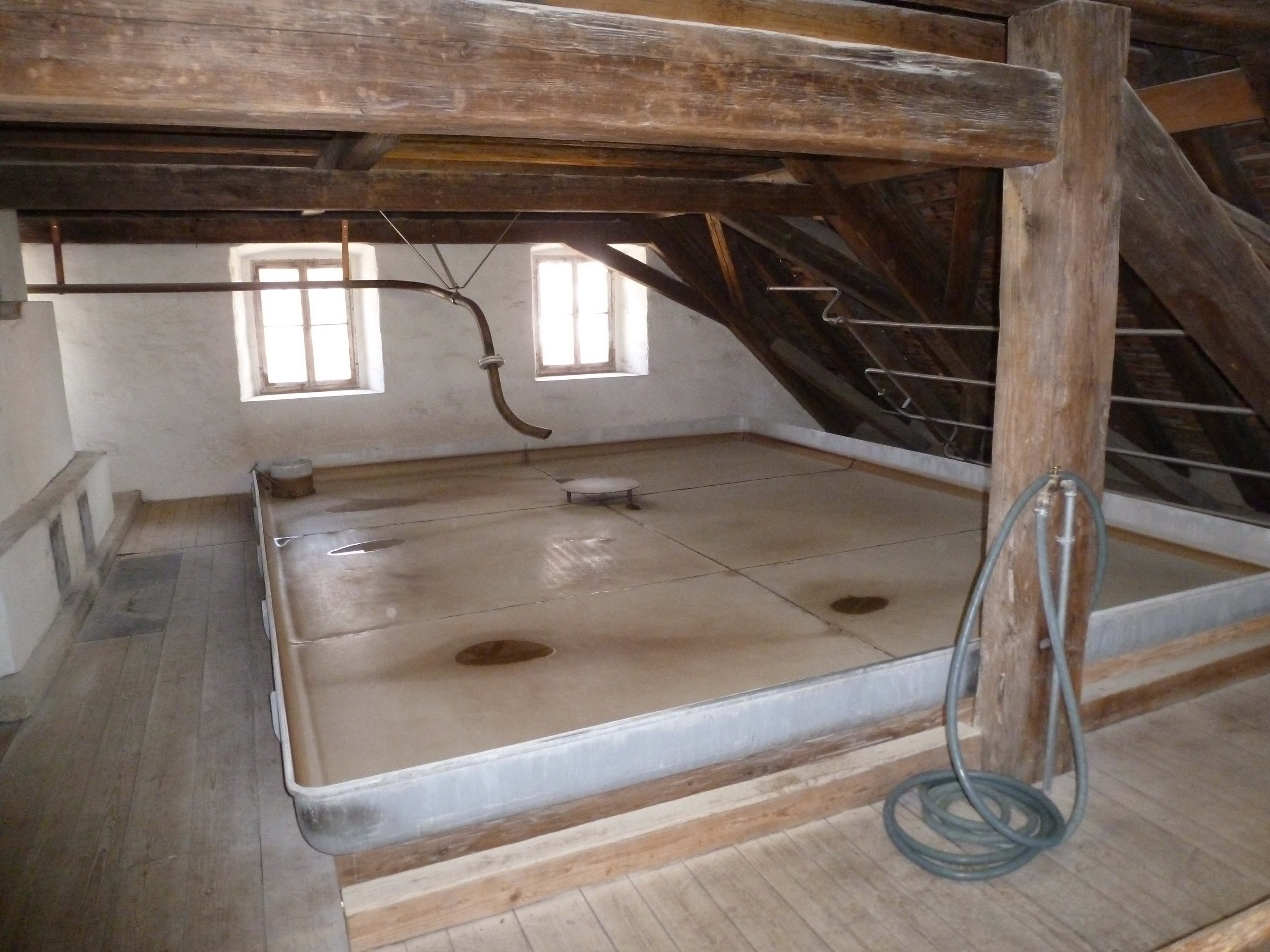 Die alte riemengetriebene Schrotmühle wird laut Aussage des im letzten Sommers dort tätiger Brauers nicht mehr verwendet. Steht dort nur noch für die Optik.
