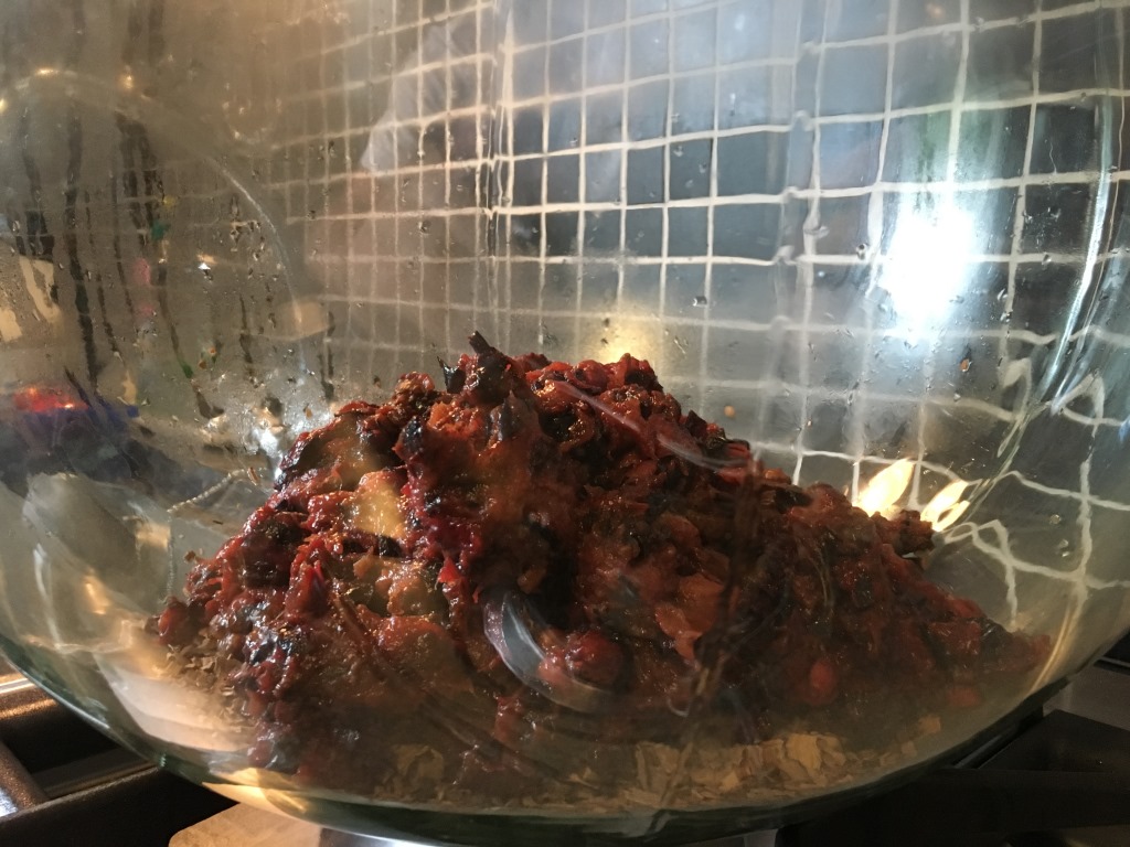 Ich habe den Hopfen 2 Stunden gekocht. Zwischendurch habe ich die Schlehen zermatscht und mit den Eichholzspähnen in den Gärballon gegeben: