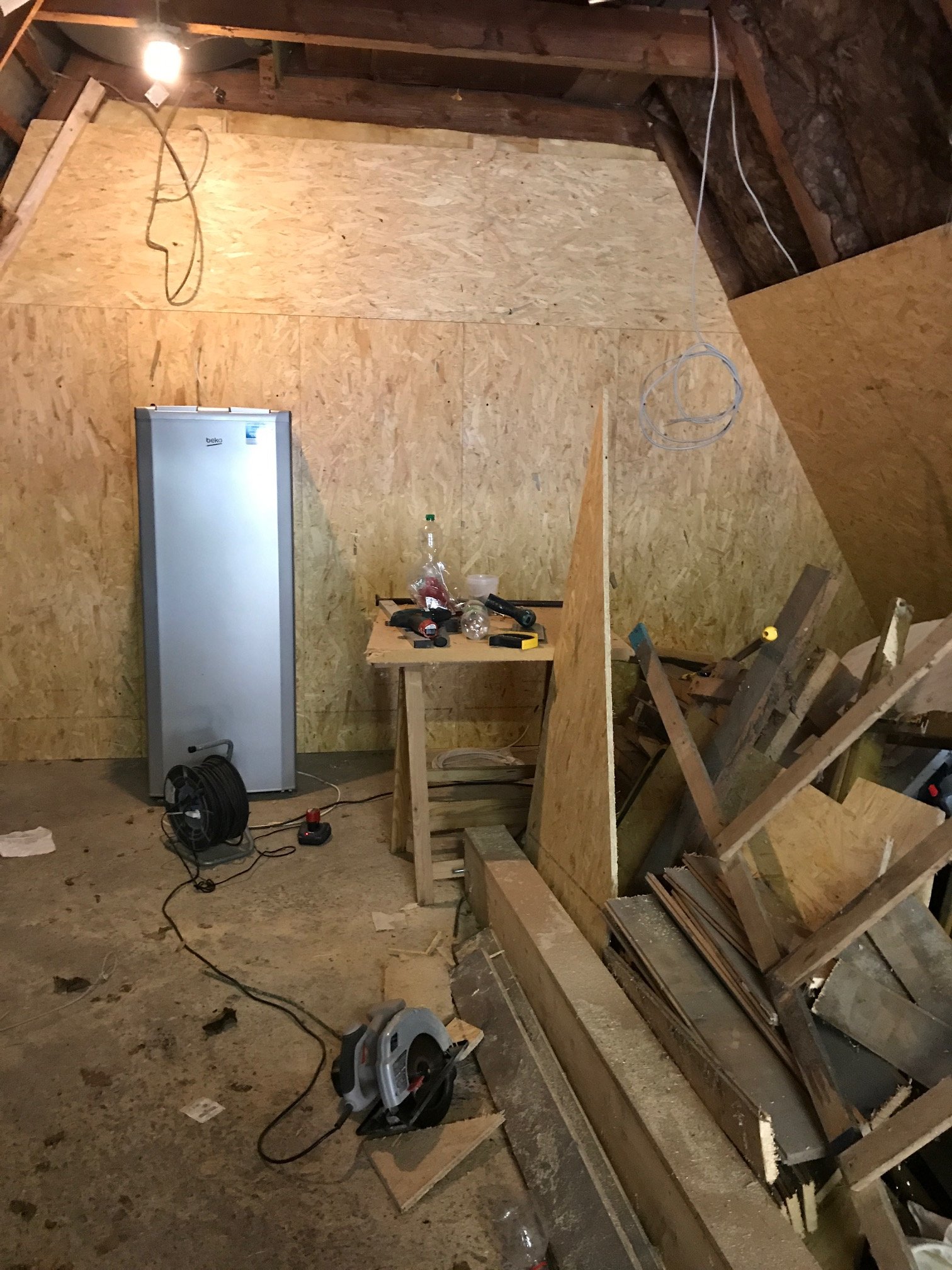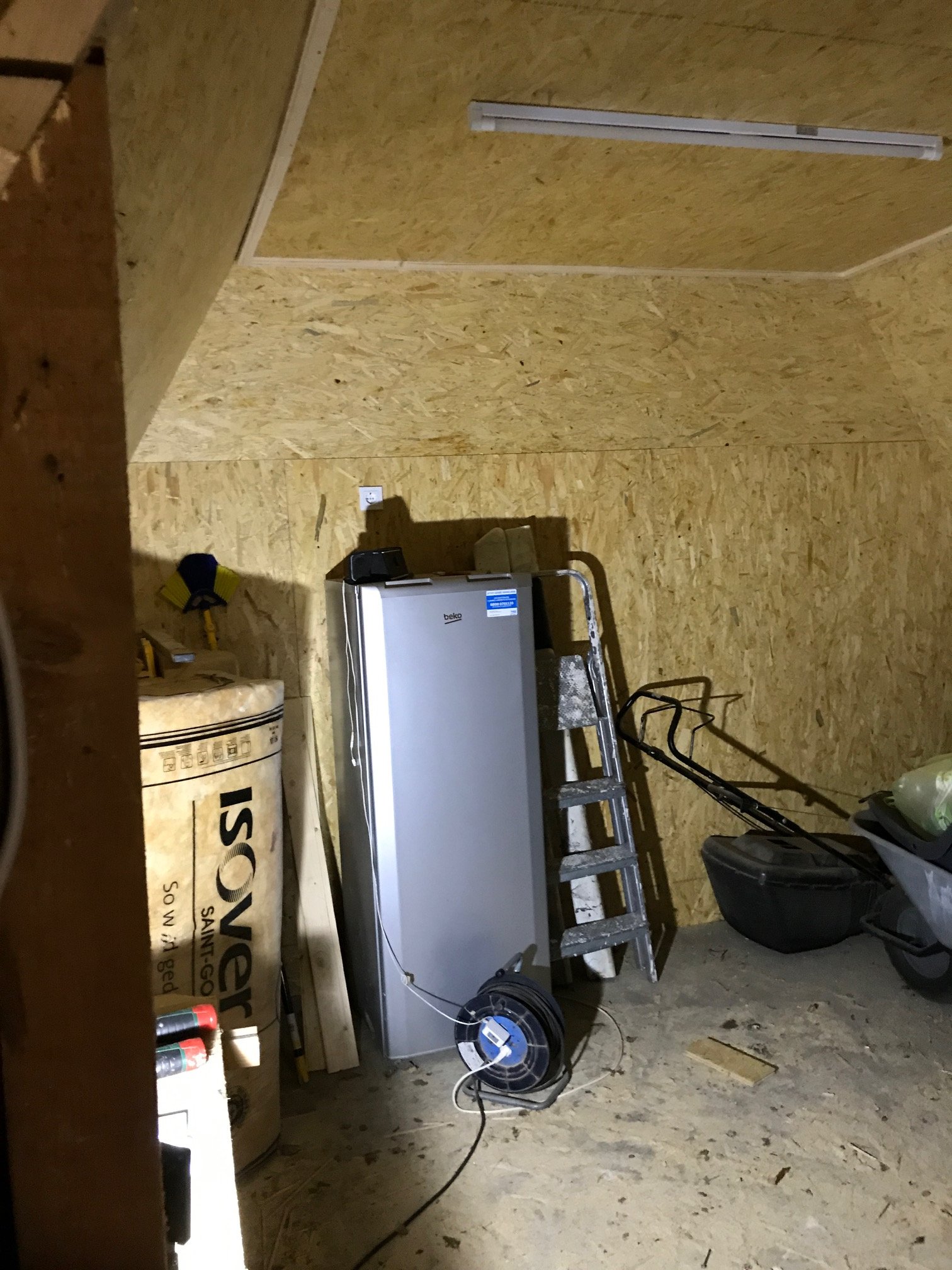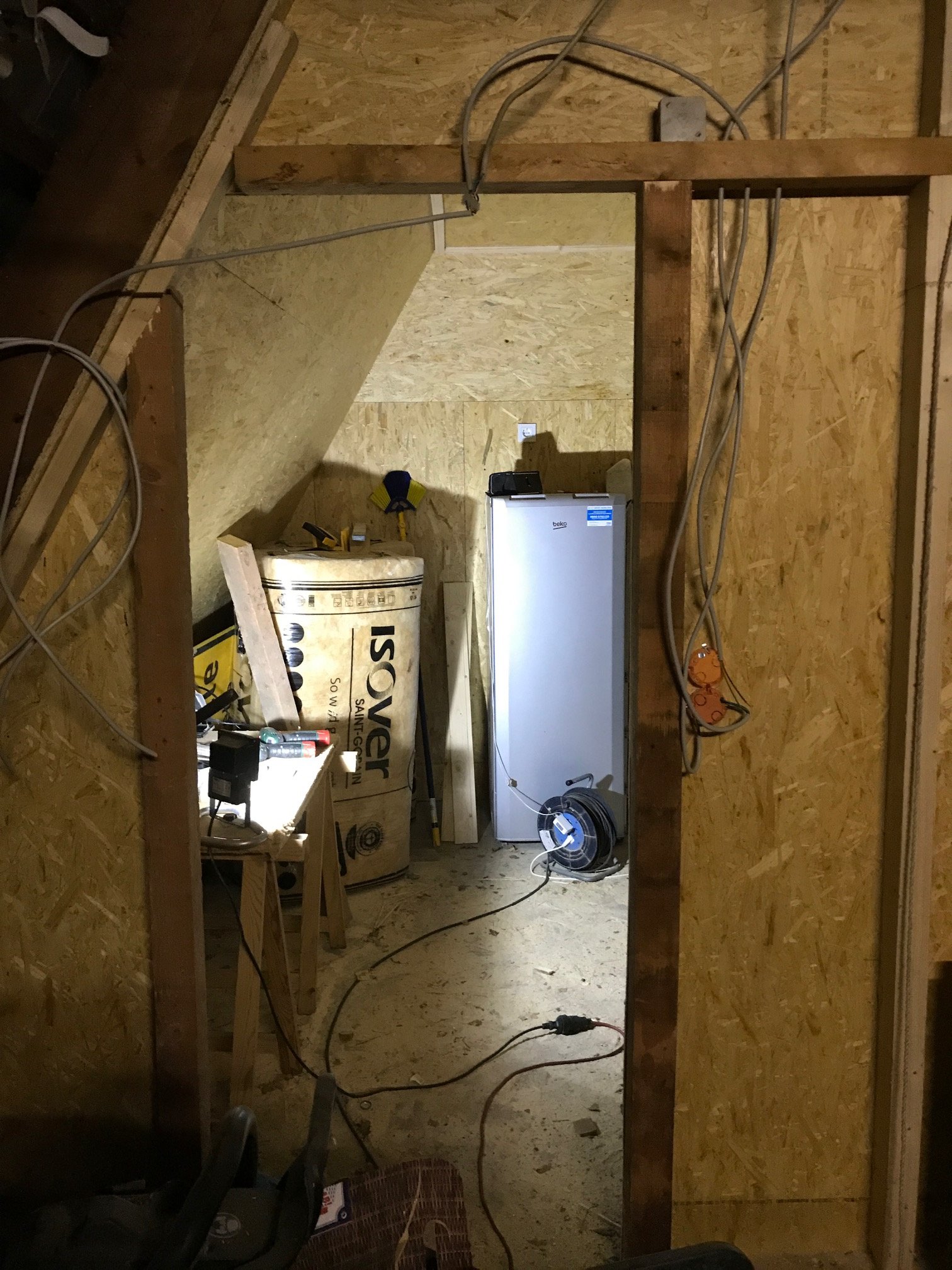 Hier sieht man schon die ersten strippen für Licht und Steckdosen Es sieht noch total wüst aus aber das erste was platz gefunden hat ist einer meiner Reife Kühlschränke