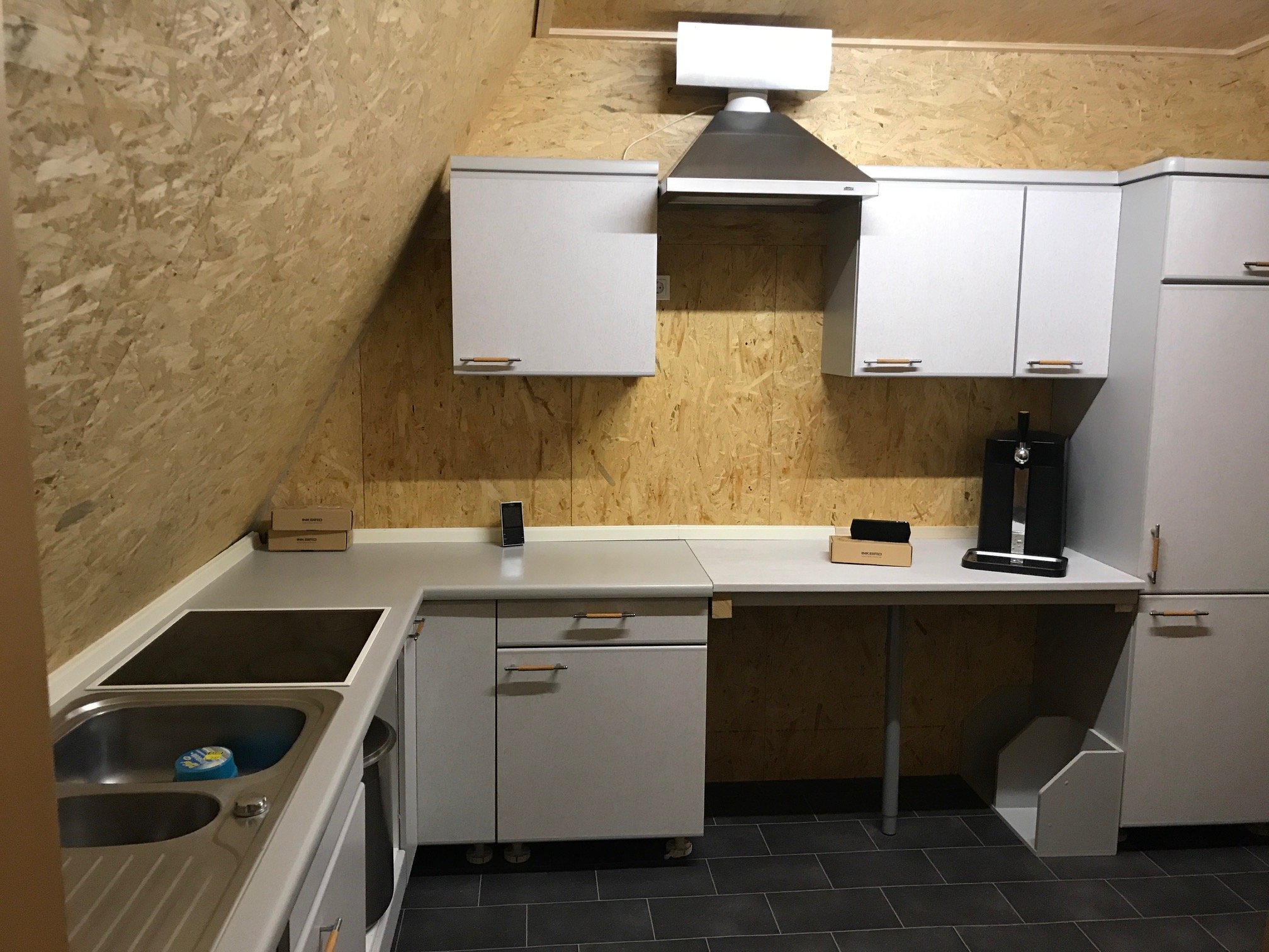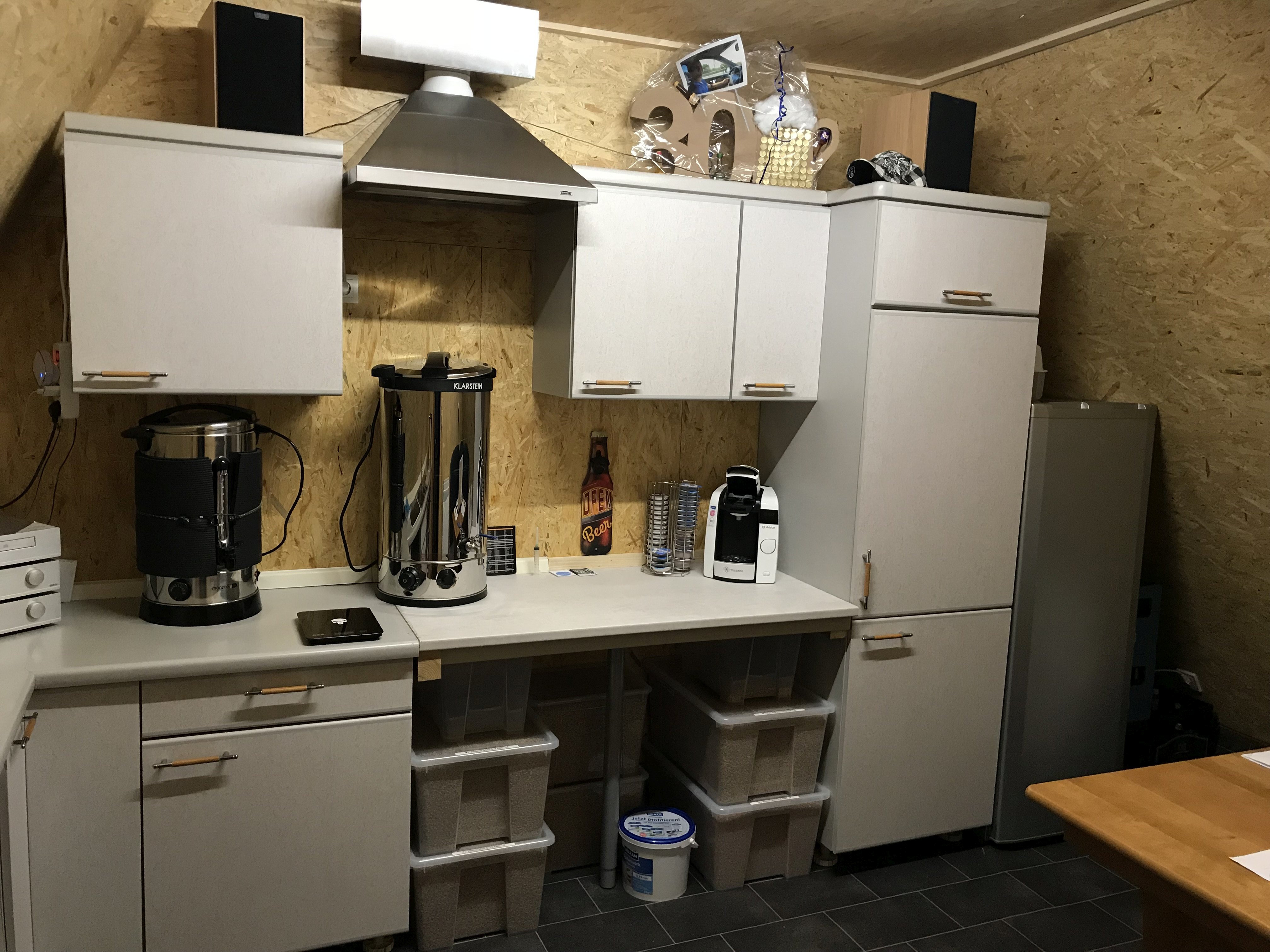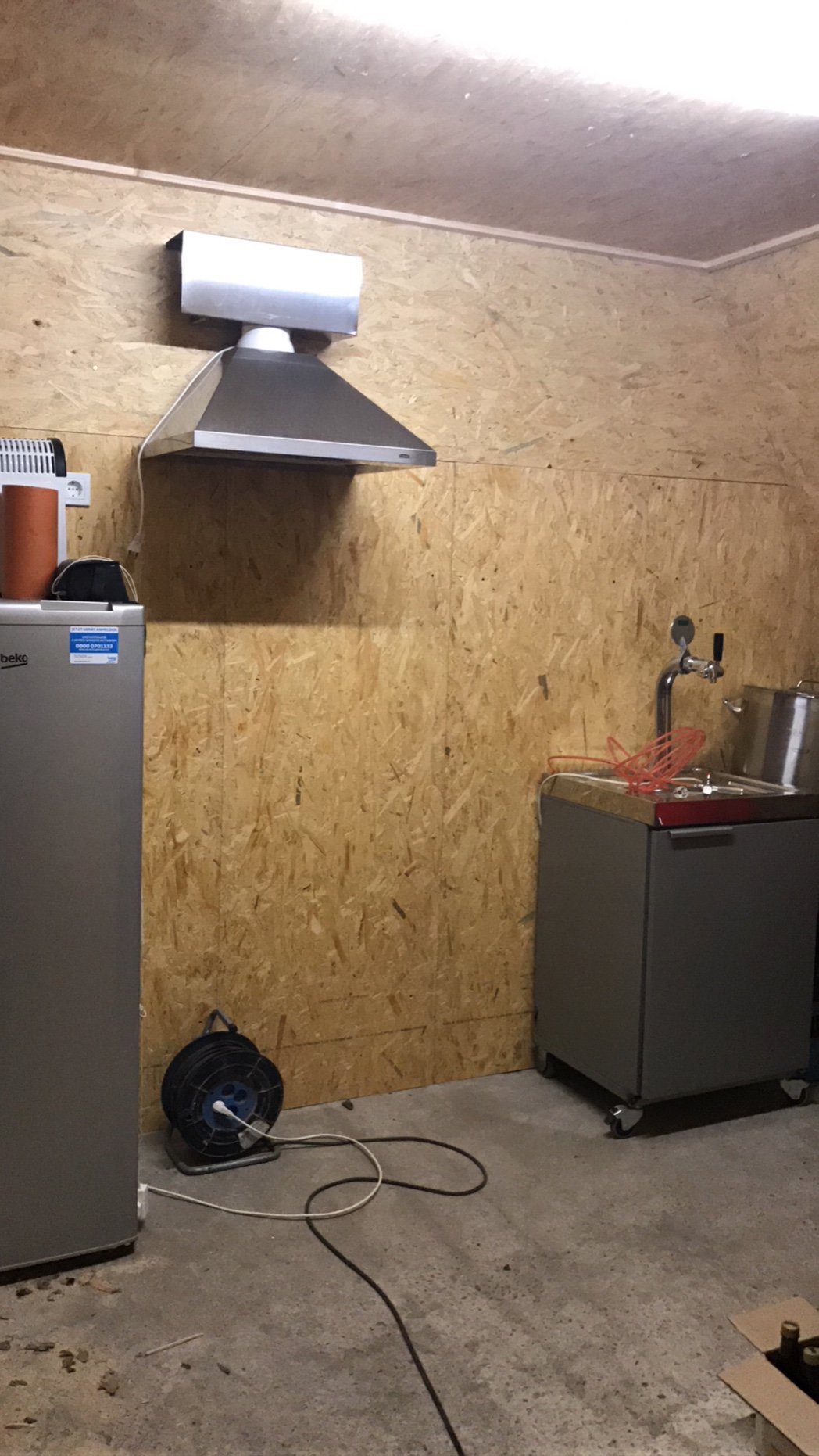 Hier treffen sich die Leitungen und hier soll auch der Sicherungskasten seinen platz finden... Erste Ansicht von der Baustelle von innen Hier oben habe ich eine kleine klappe eingebaut und darüber noch ausgebaut um im nachhinein noch etwas Stauraum zu haben oder irgendwann mal ein Malzlager dort einzurichten... Die Dunstabzugshaube findet seinen ersten provisorischen Platz und macht ein schönes Bild an dem Tag hatte ich ordentlich was geschafft und habe den Dunstabzug nur aufgehängt um mir ein Bild zu machen und etwas rumzuspinnen, die Position hat sich im nachhinein nicht groß geändert. Die Mobile Zapfanlage wurde rein gerollt und von da an stand für mich schon fest, das die kleine schöne Zapfe hier leider nicht mit einzieht.