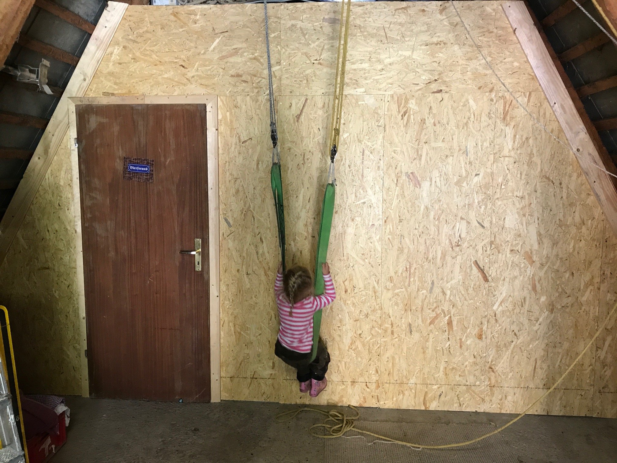 Der Rohbau ist nun fertig und eine Provisorische Tür ist auch schon drin bis die bestellte Tür eintrifft, das Kind hat auf jedenfall schonmal Spaß an der 0815 selbstbau Schaukel...