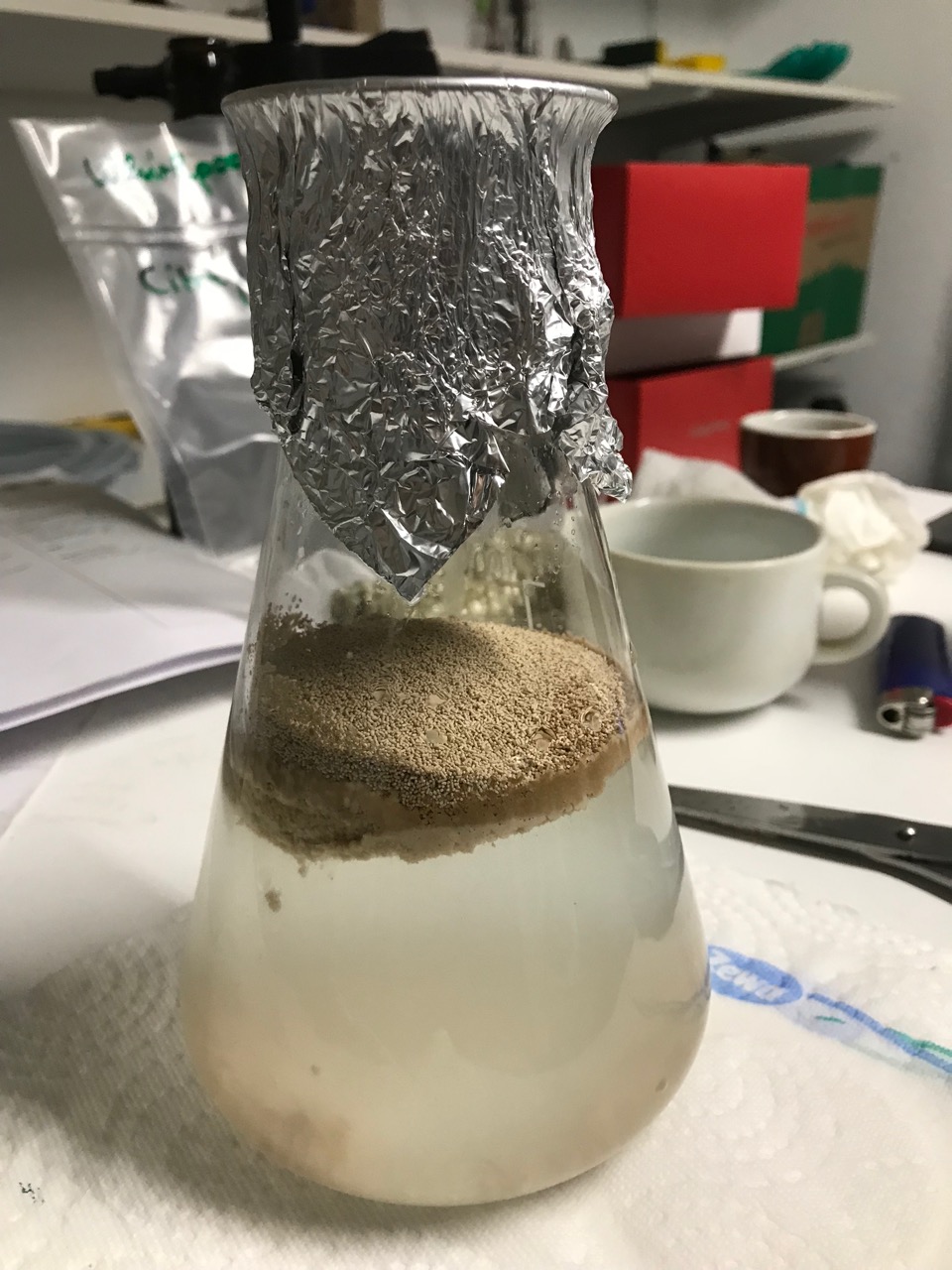 Währenddessen Hefe rehydriert (etwas früh, wie sich zeigen sollte, aber aus einer Intuition heraus wenigstens 4 Päckchen genommen statt der berechneten drei...)