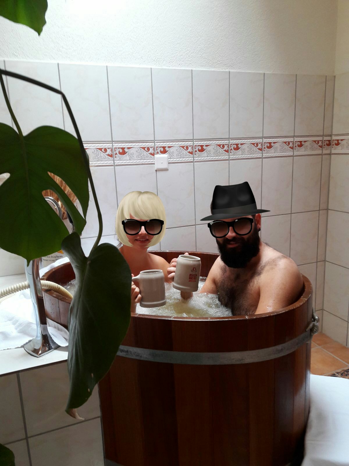 Soeben sind wir aus dem Bierbottichbad (inkl. Freibierzapfhahn, leider nur Rugenbräu Lager) gestiegen und freuen uns nun auf das Biermenu mit Biercarpaccio, und Bieramisu.