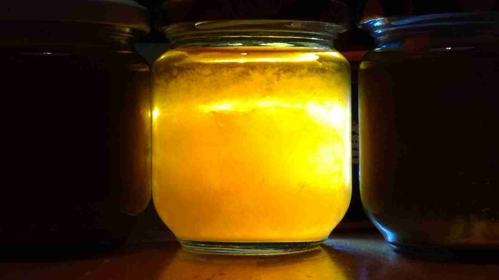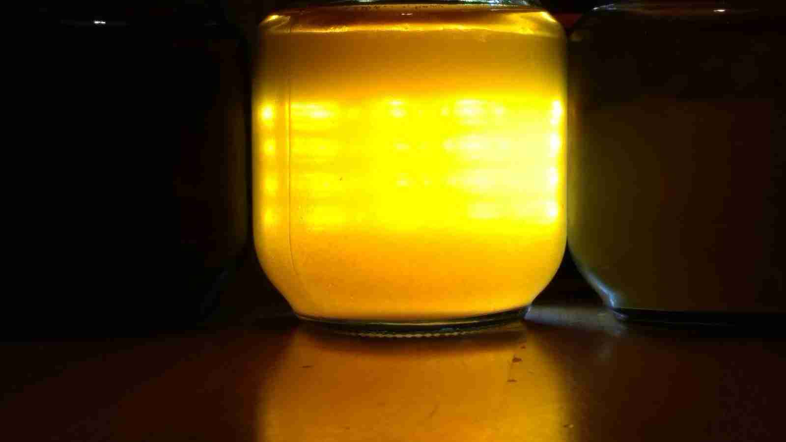 Hier eine Probe nach der Zugabe von etwas Natronlauge . Absolut klar im vergleich zur linken originalprobe.