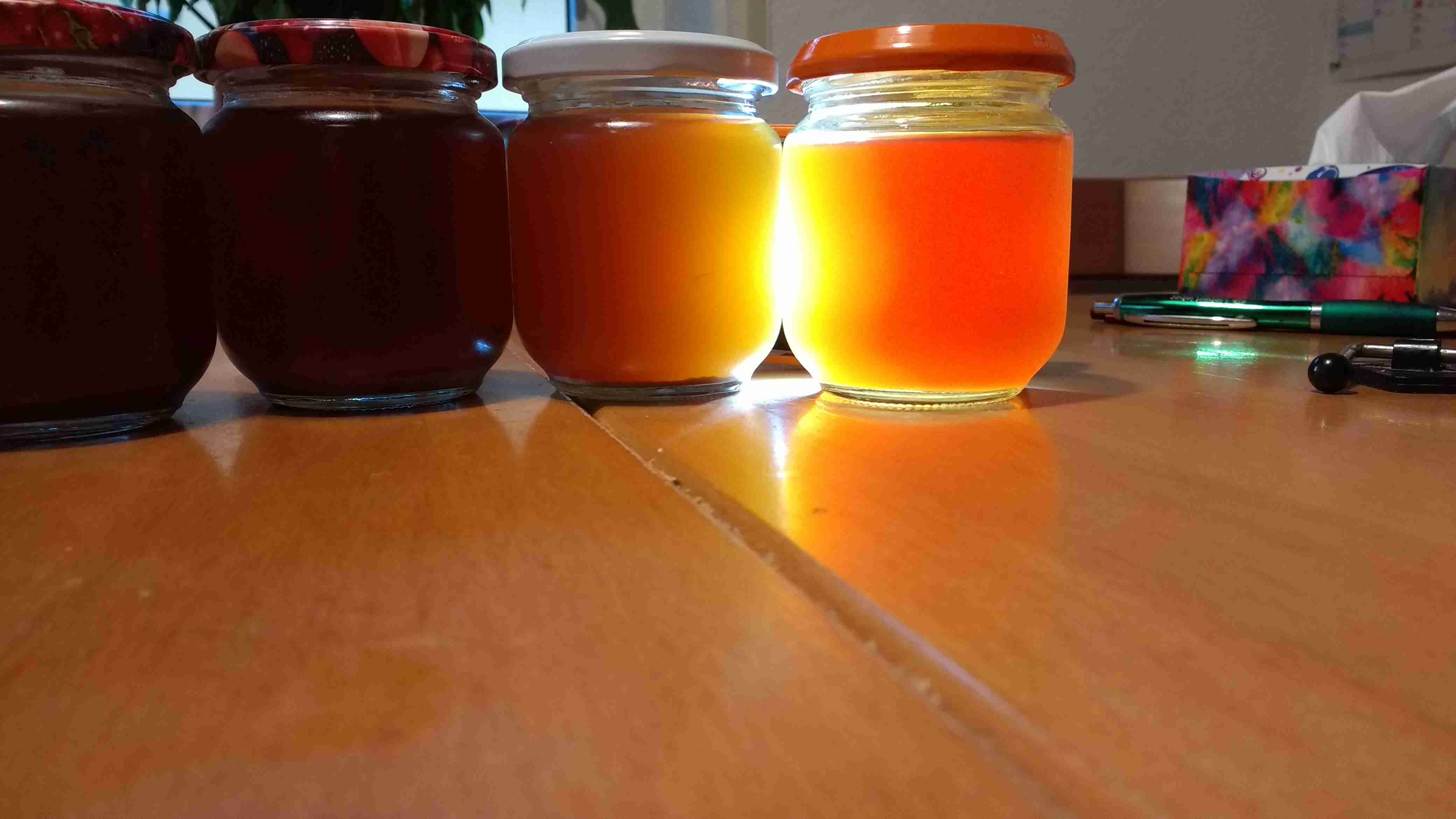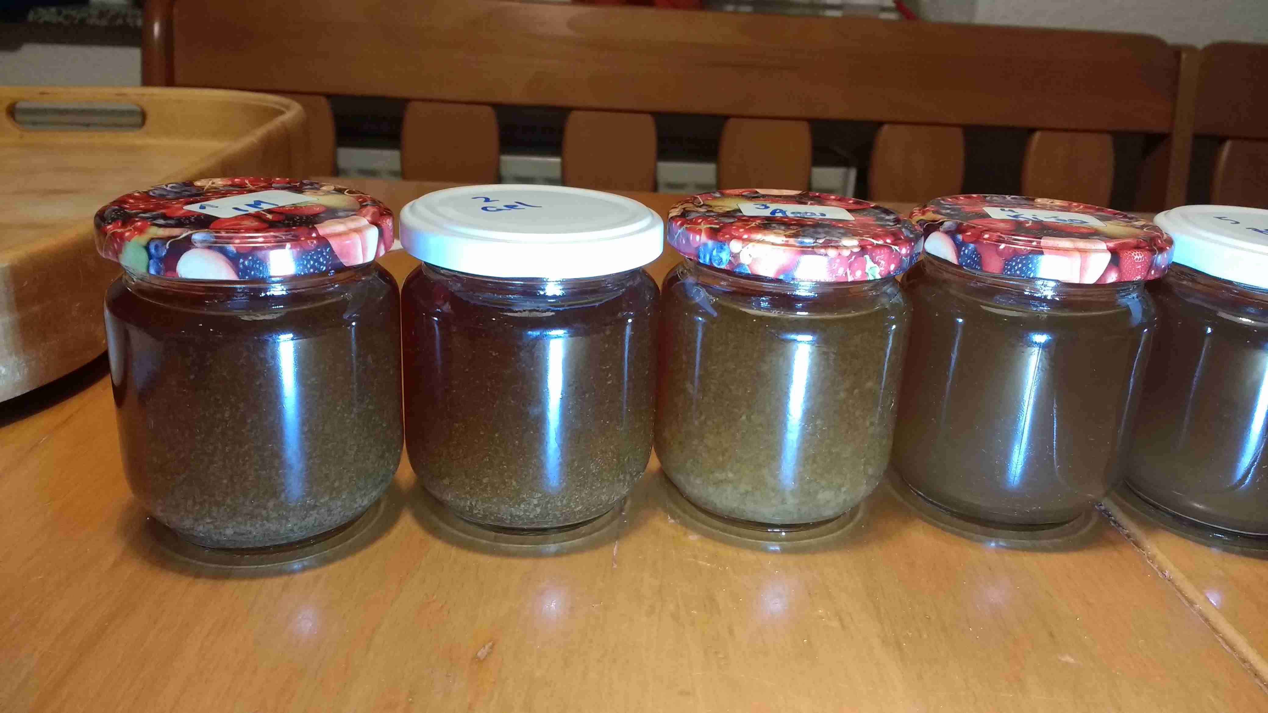 Von jeden Schönungsmittel wurden 0.5g in 50ml Wasser eingerührt, dann davon 5ml in die Gläser gefüllt und eingerührt. Das sollte ungefähr 5g Schönungsmittel auf 10 l Bier entsprechen.