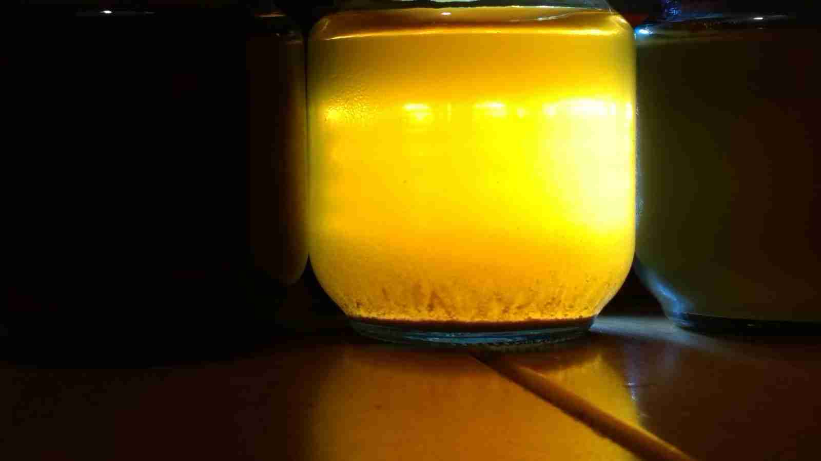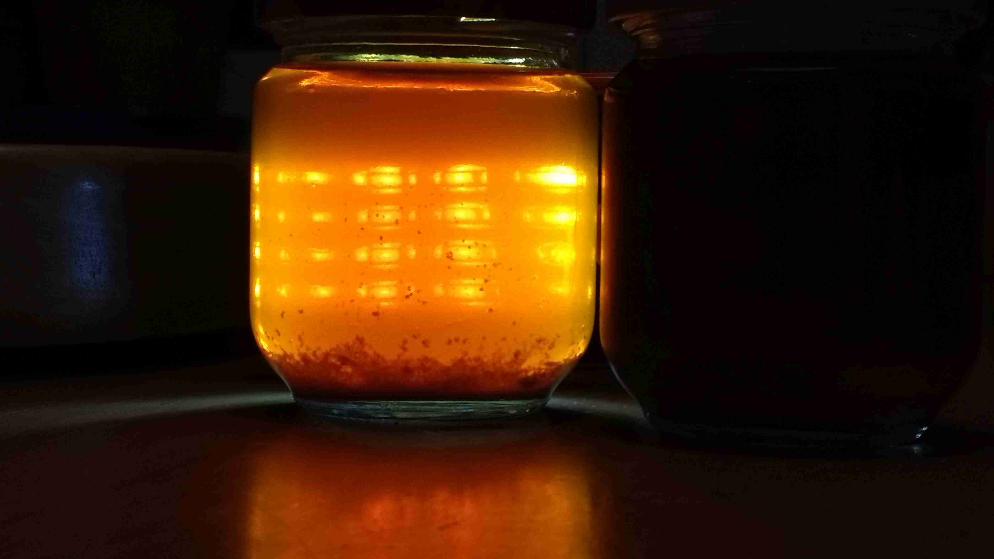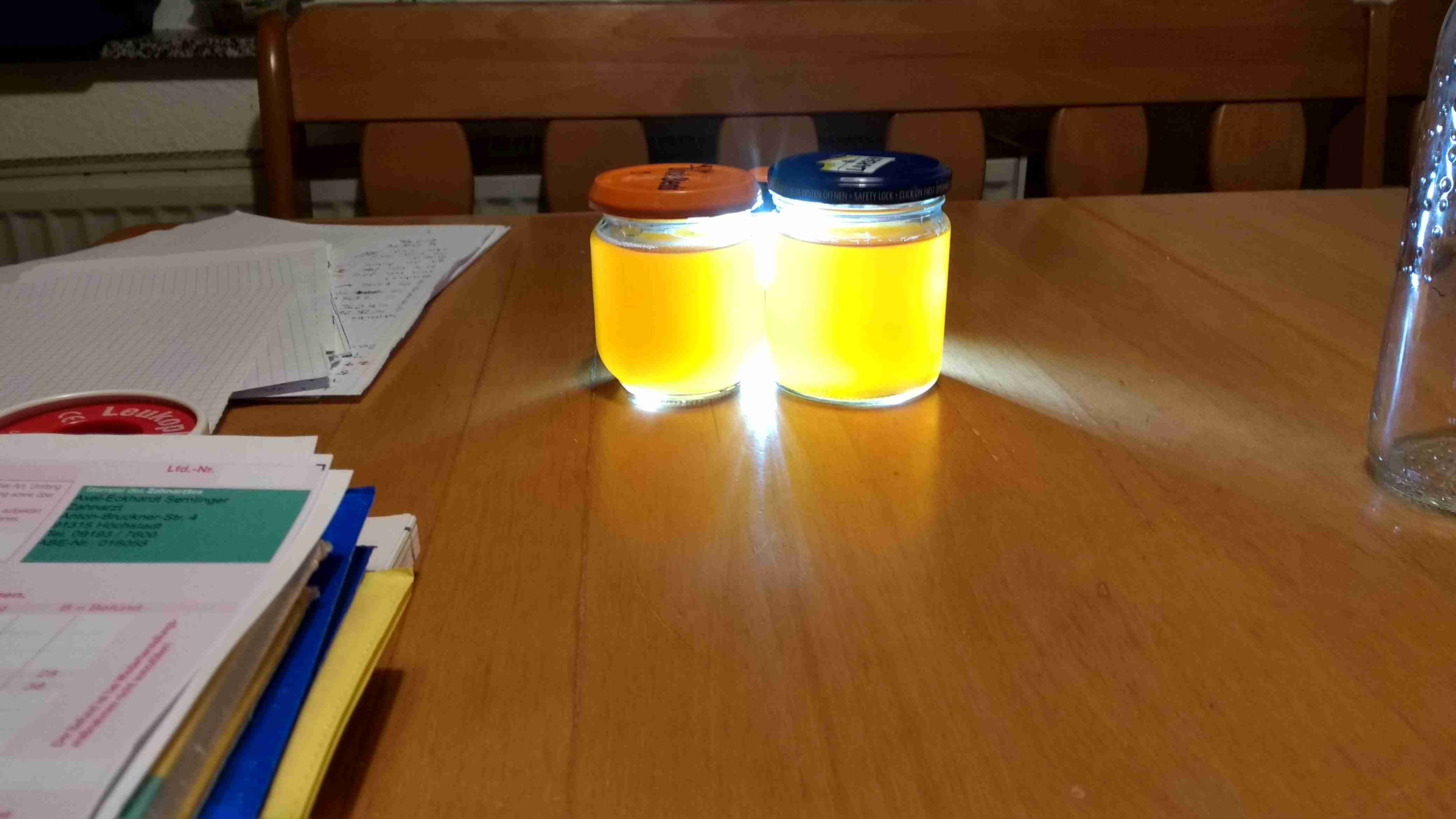 Hier eine Probe nach der Zugabe von etwas Natronlauge . Absolut klar im vergleich zur linken originalprobe.