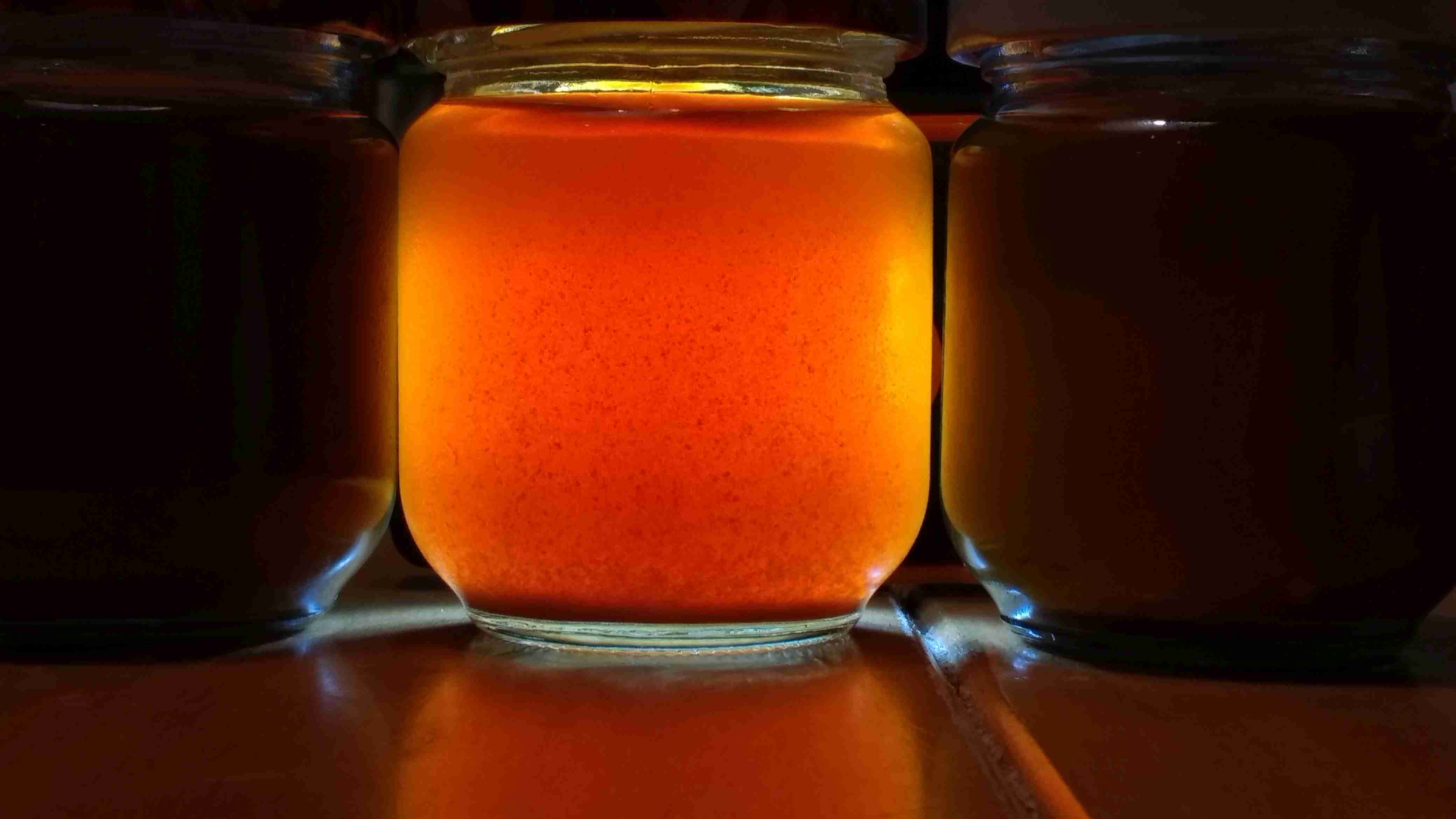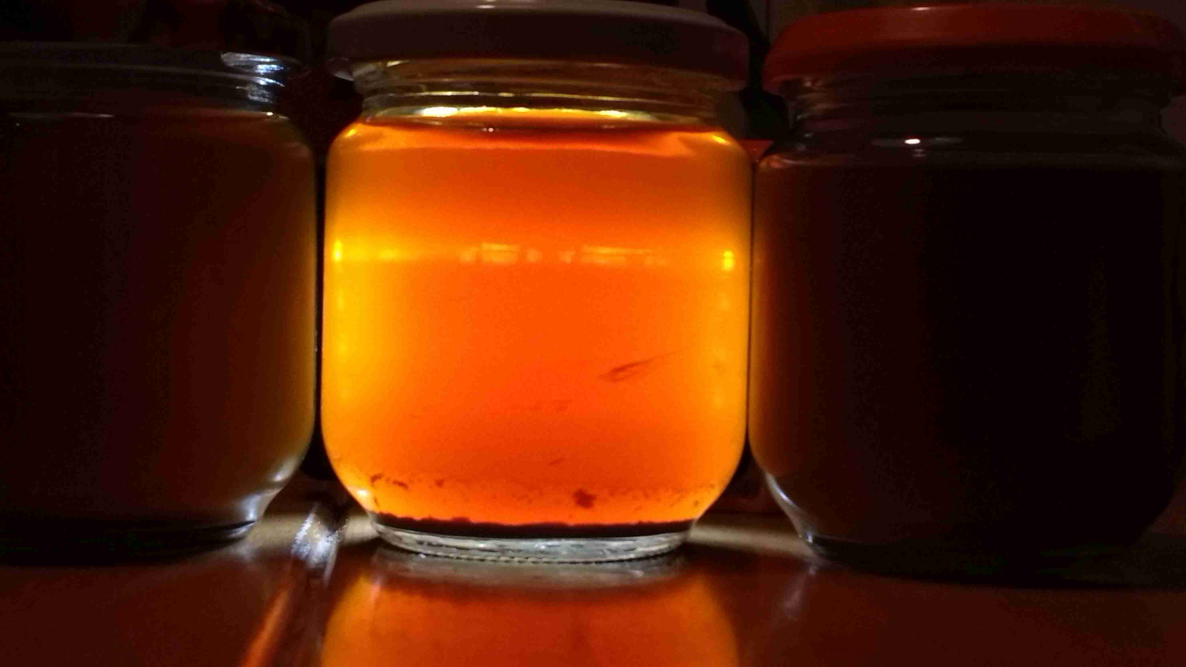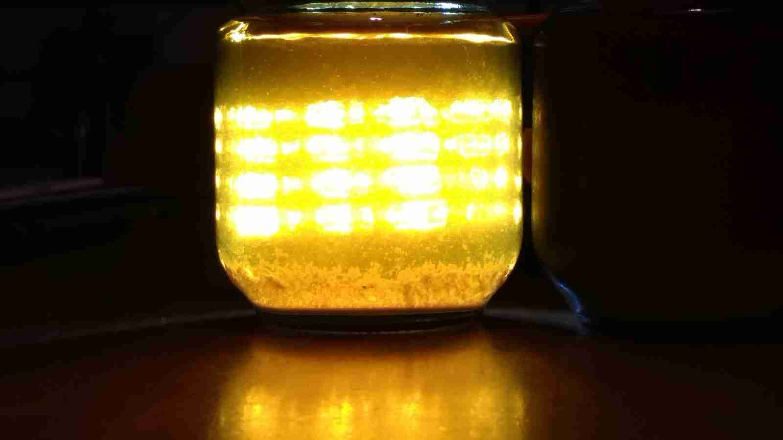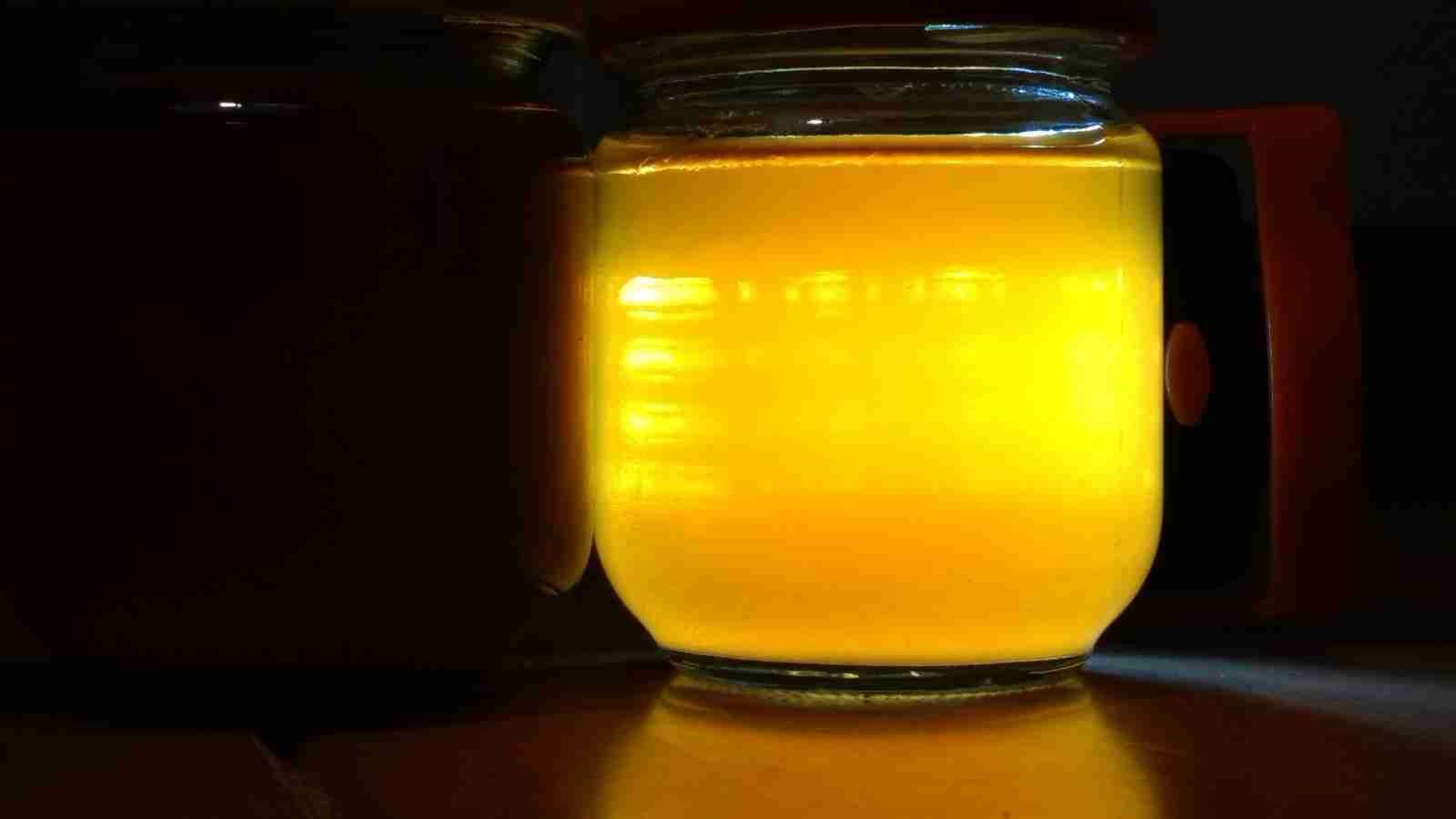 Hier eine Probe nach der Zugabe von etwas Natronlauge . Absolut klar im vergleich zur linken originalprobe.