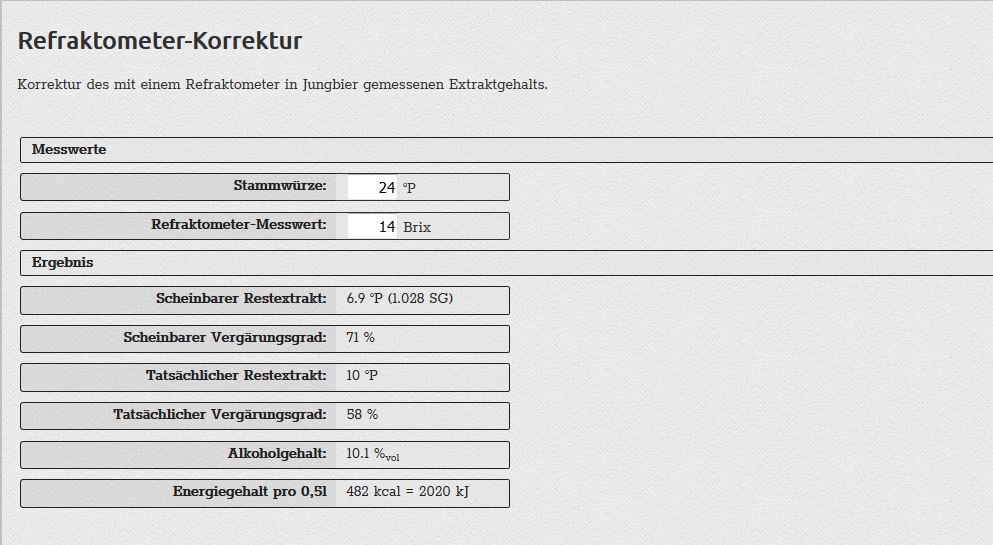 Also mal die verschiedenen Rechner bemüht und dabei fest gestellt, dass nach der Hompage fabier.de erst 8% Alc erreicht sind. Dies würde bedeuten, dass noch eniges vergärt werden müsste.