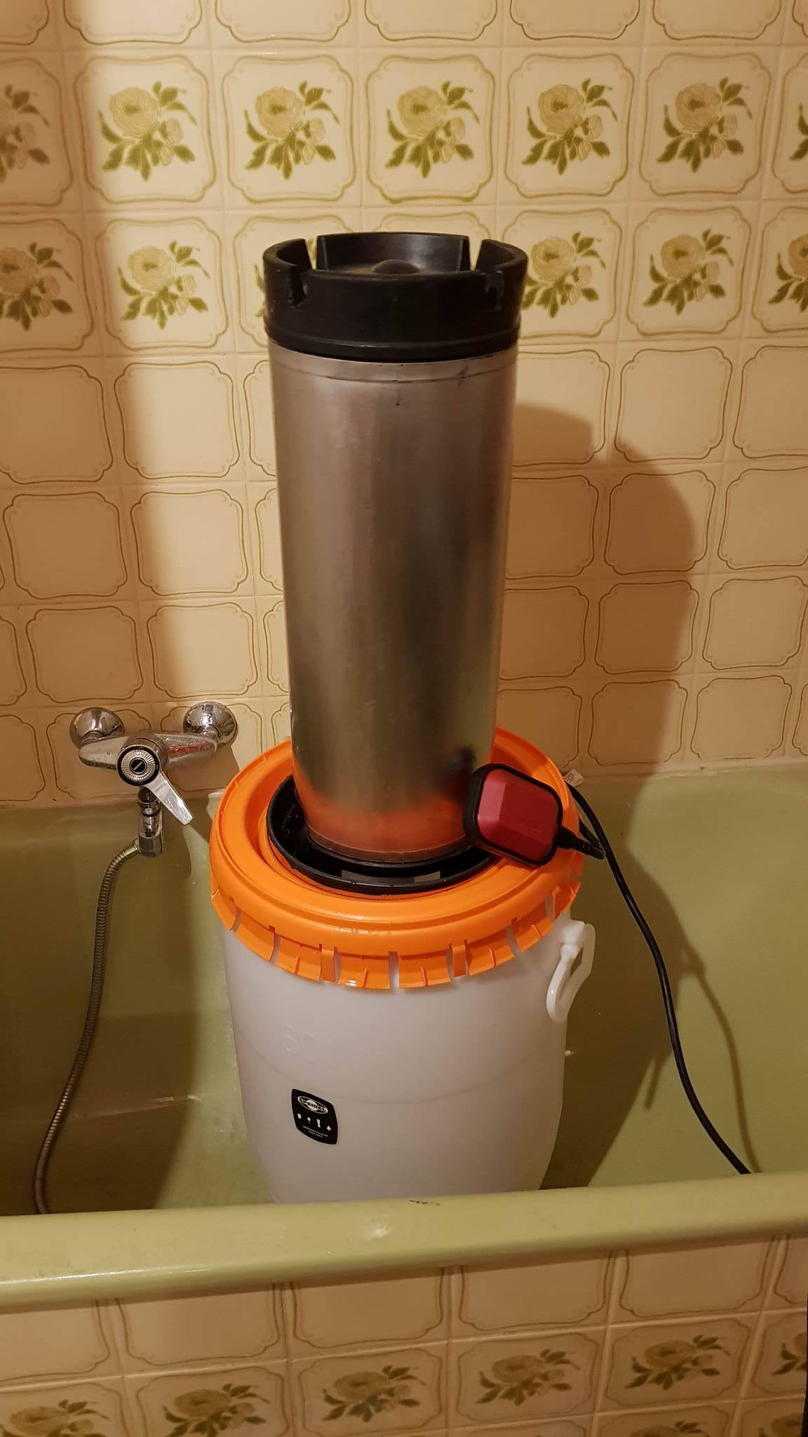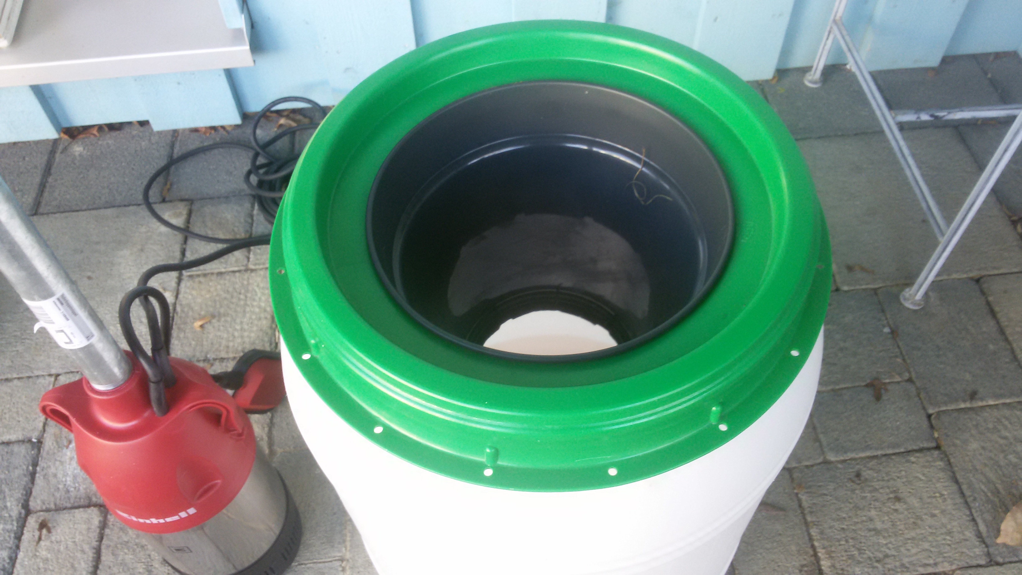 In den Kasten kommt die Pumpe mittig rein, die beiden KG Muffen draufgestellt, das Rohr mit der CIP-Düse reingeschraubt, Reinigungslösung reinkippen bis die Pumpe abgedeckt ist, KEG/Carboy rauf, und los gehts. Relativ leise und stetig wirds immer sauberer.