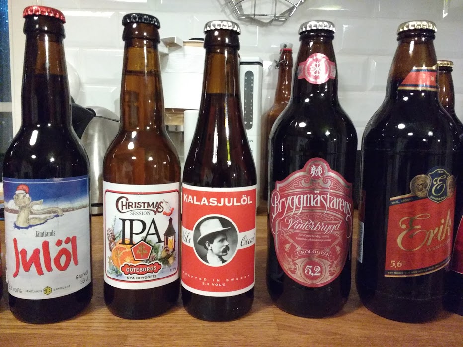 Julöl, also Weihnachtsbier, ist ein großes Ding hier. Ich habe eben beim Systembolaget einen Teil der Auswahl mitgenommen, um die Zeit, bis mein eigenes fertig ist, zu überbrücken.