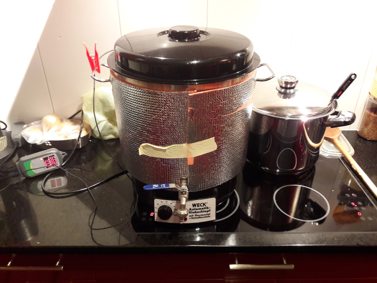 Der Wasserkocher rechts brauche ich zum vorlegen von 1.5L heissem Wasser in den Läuterbottich (Lufteinschluss unter dem Gitter vermeiden und Läuterbottich vorheizen)
