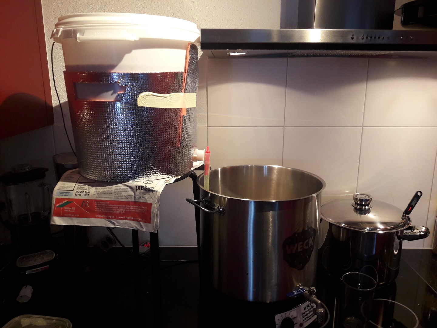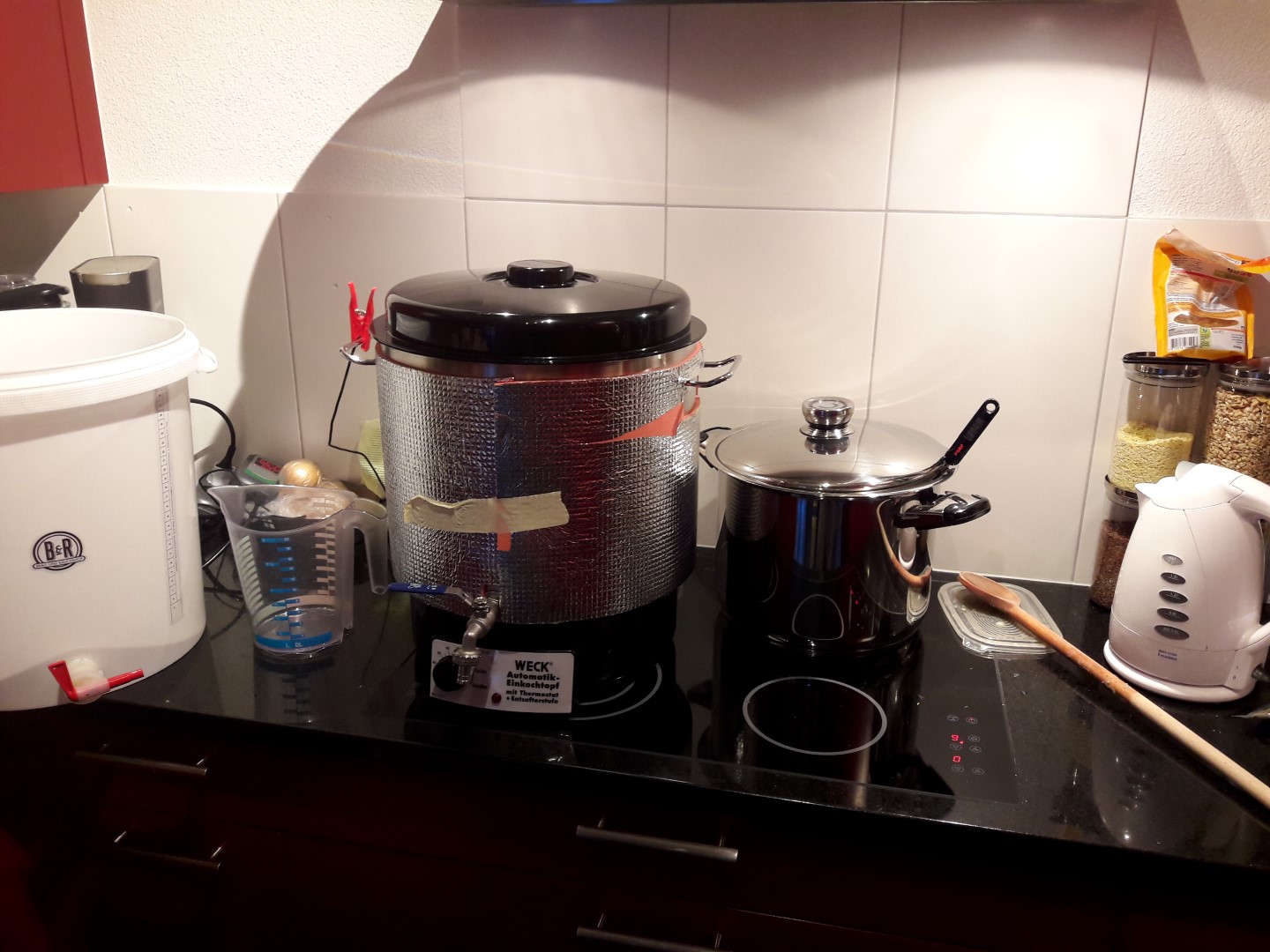 Der Wasserkocher rechts brauche ich zum vorlegen von 1.5L heissem Wasser in den Läuterbottich (Lufteinschluss unter dem Gitter vermeiden und Läuterbottich vorheizen)