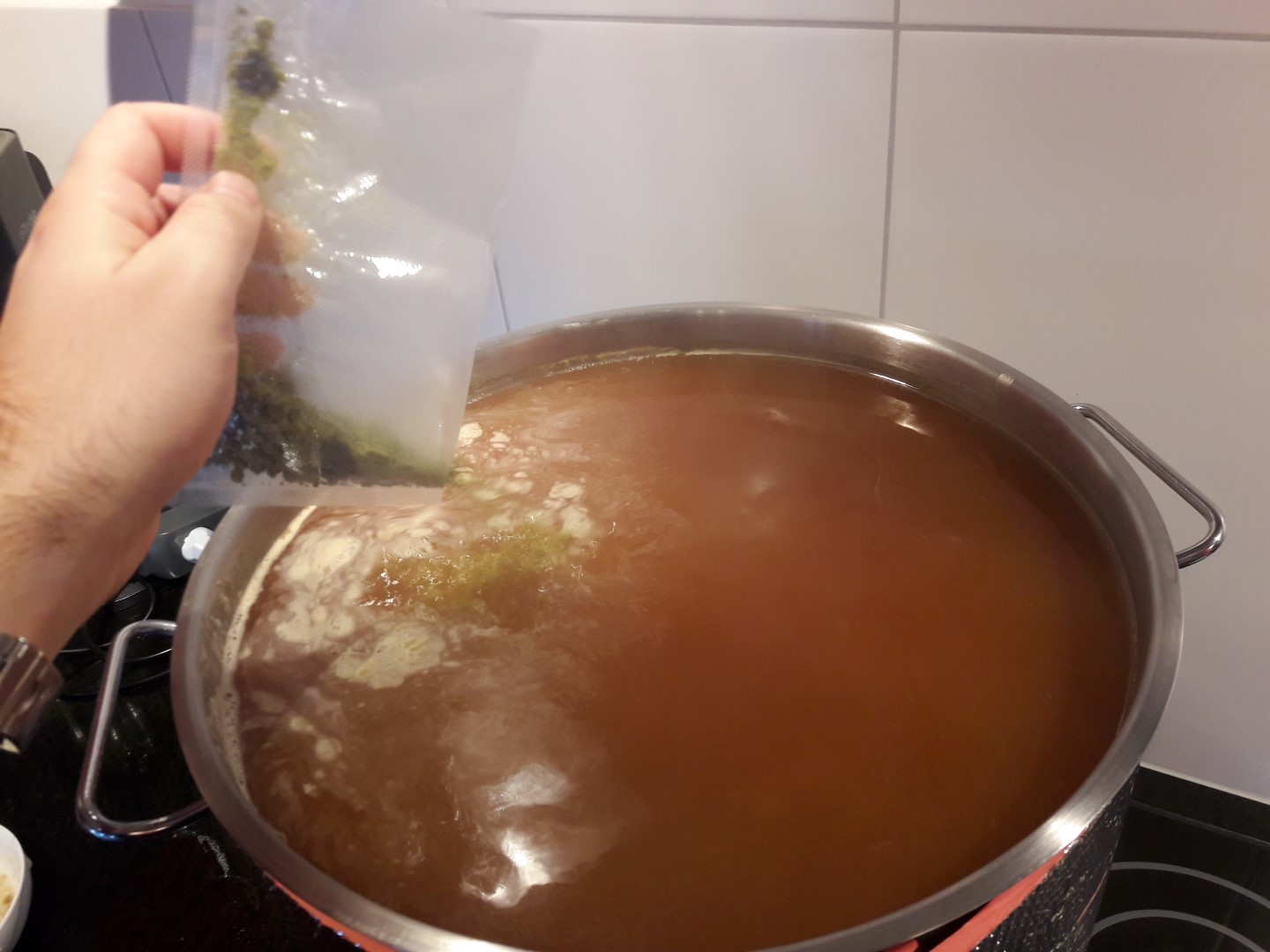 Das ist bei meinem Weck "Wallend Kochen", mehr liegt leider nicht drin, reicht das aus oder muss ich da was machen? Während dem Kochen wird der Treber eingesackt für Nachbars Kühe: Vor jeder Hopfengabe entferne ich den Bruch obenauf, da sich sonst der Hopfen nicht schön verteilt, sondern nur am Schlurz kleben bleibt