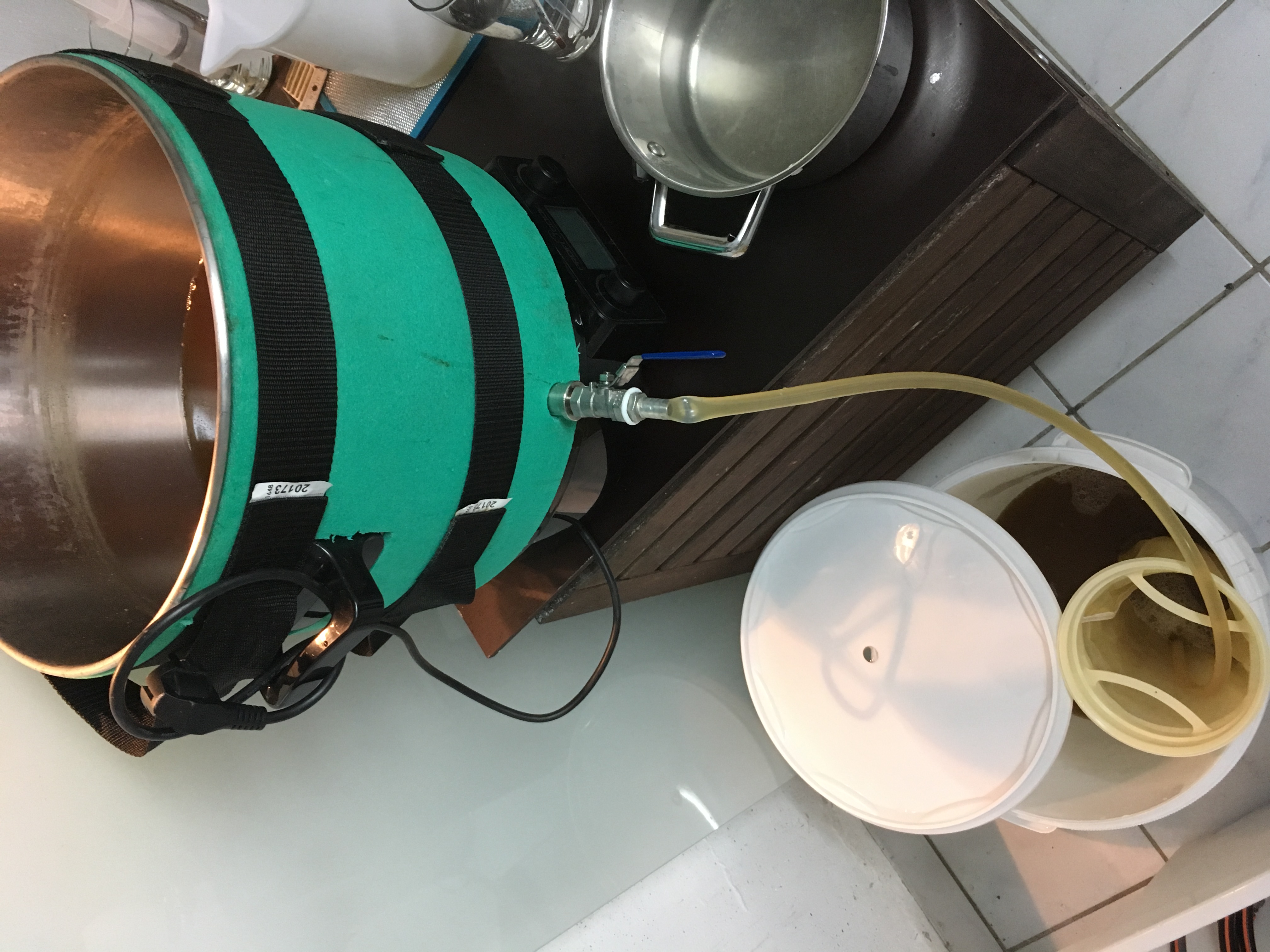 Es ist nicht alles vom NG durchgelaufen. Ich habe bei 2°Brix aufgehört zu läutern. Ca. 2-4 Liter sind im Läutereimer mit dem Treber verblieben.