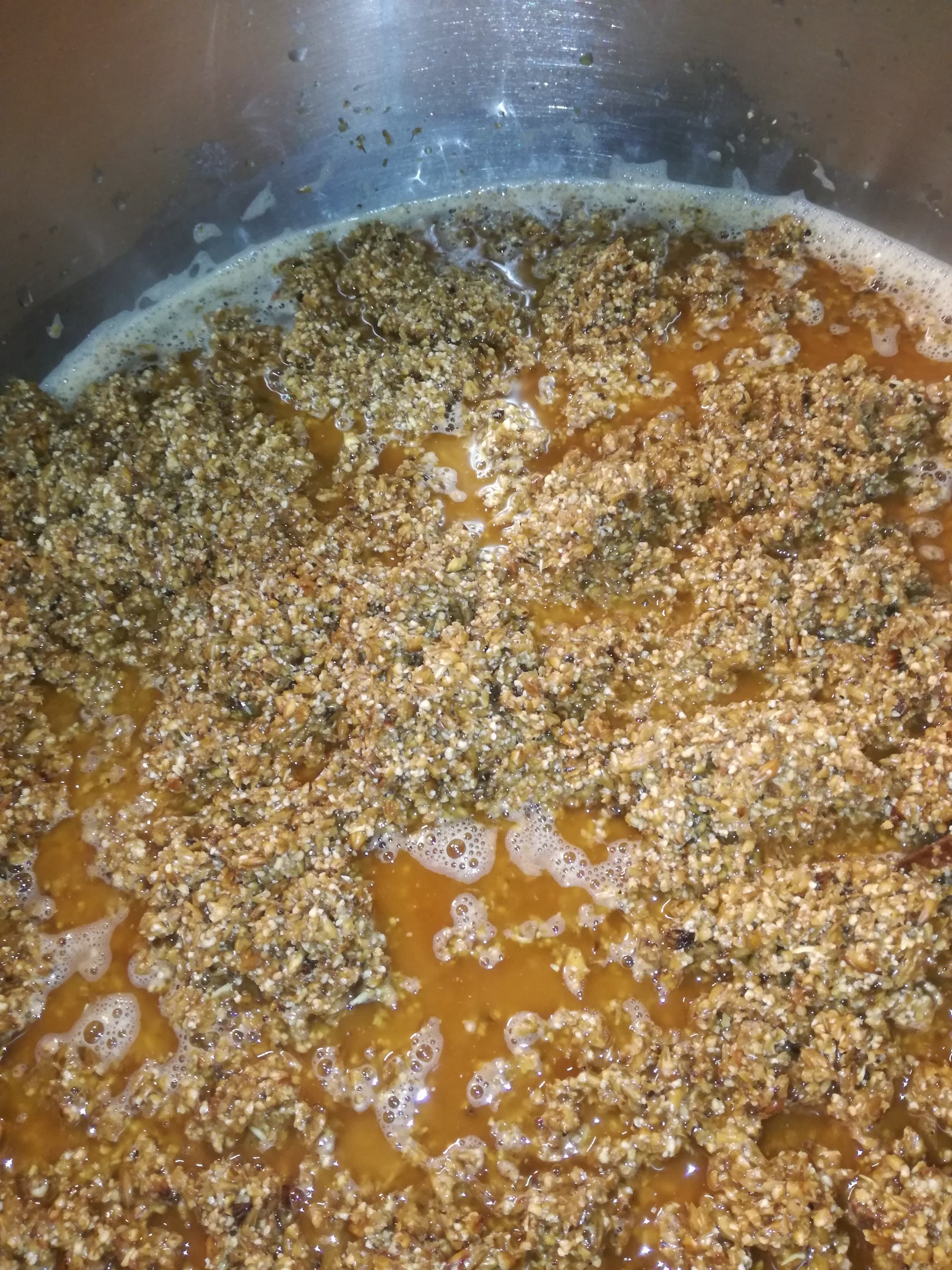 Die Dickmaische habe ich umgeschöpft. Die Dünnmaische war über die Läuterhexe abgelassen. Insgesammt waren es 9h mit Hopfenkochen incl schroten mit Handkurbel.