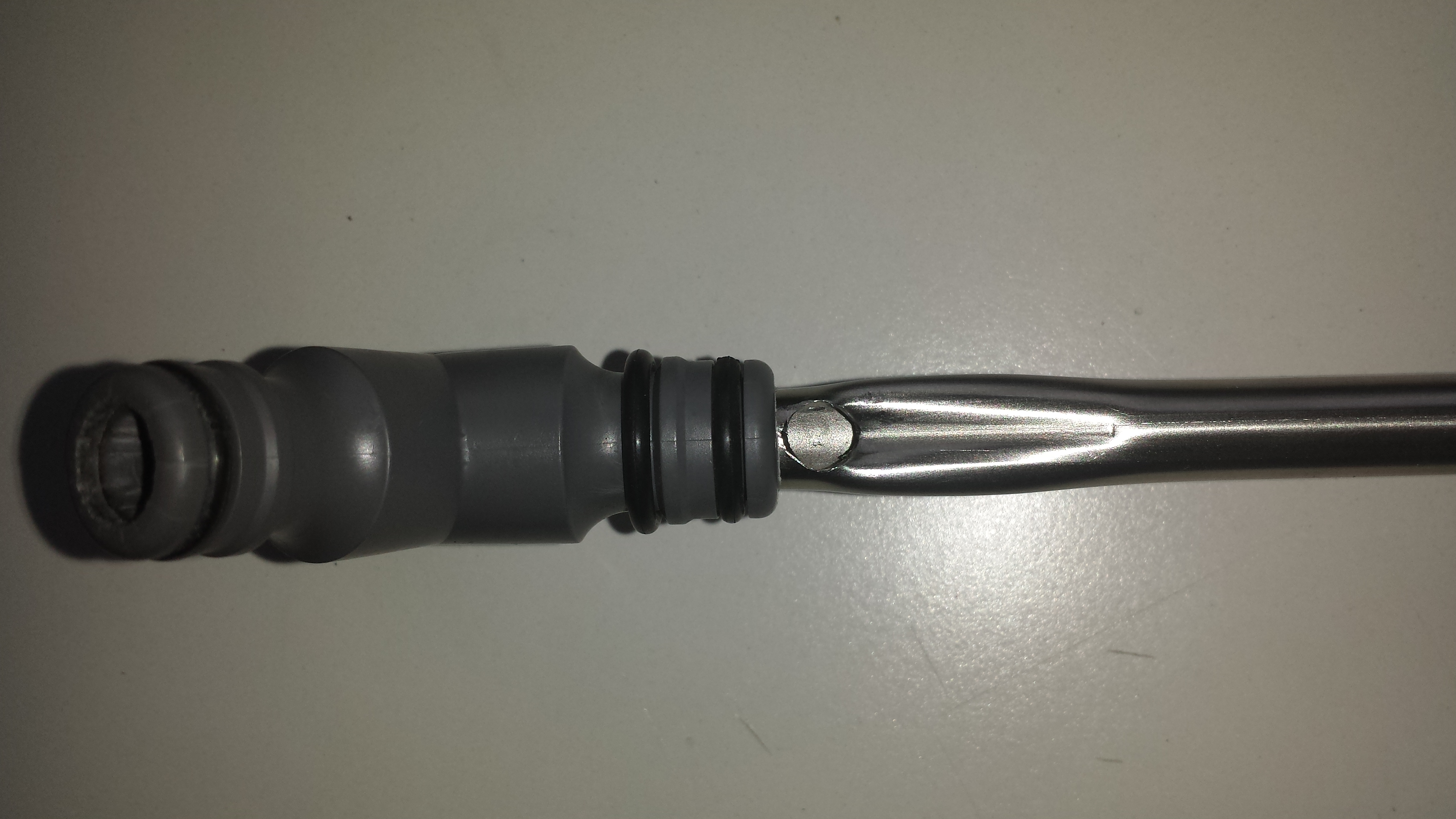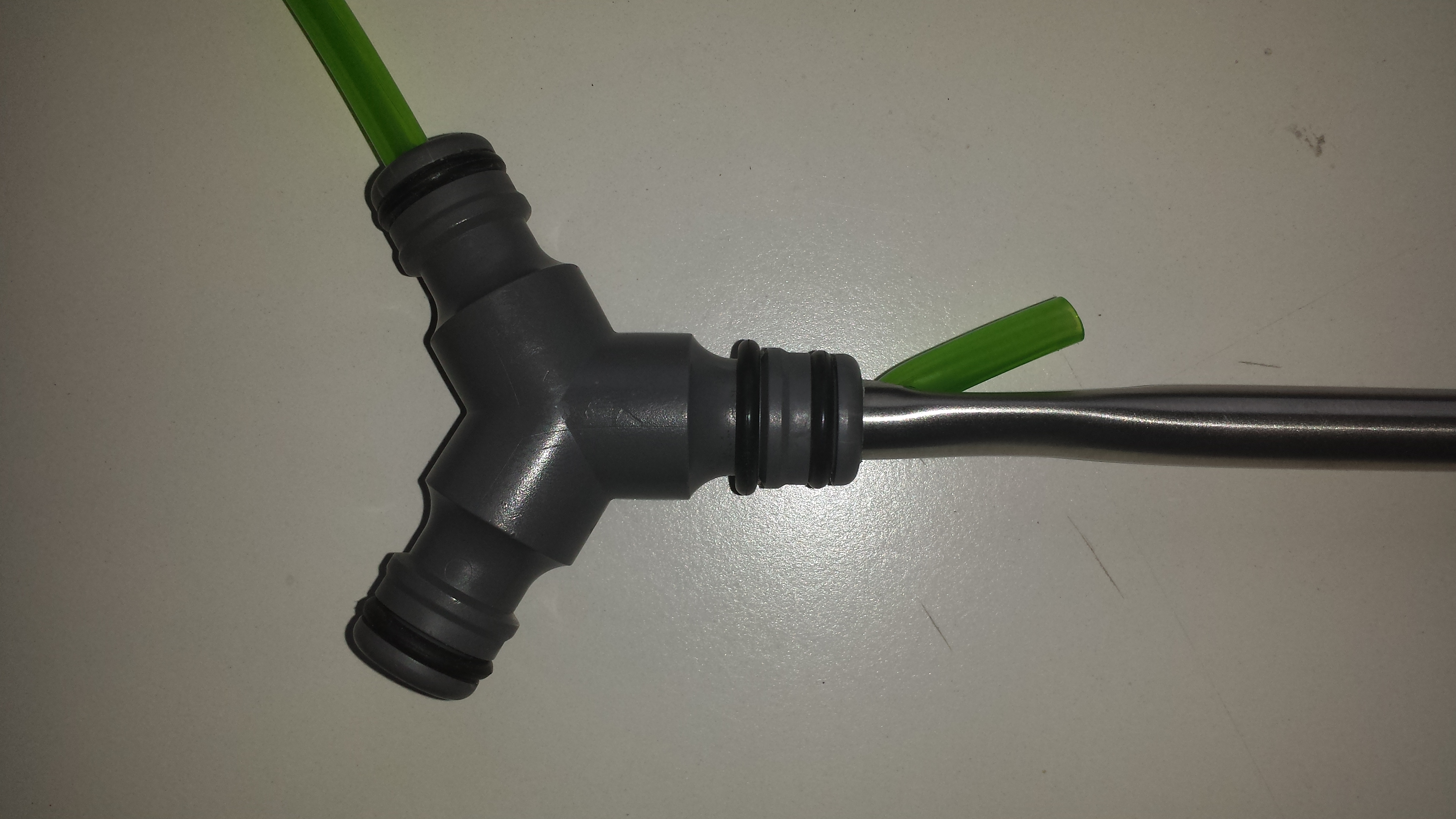Bevor das Röhrchen in den Abzweig gesteckt wird, oben in das Röhrchen ein 6mm Loch bohren und im Schraubstock unterhalb (nur unterhalb, oben muss es schön rund bleiben) des Loches eine Delle reindrücken, damit der kleine Schlauch nicht senkrecht rauskommt, sondern schräg. den Gardena Abzweig mit 10 mm aufbohren, Edelstahlröhrchen reinstecken (soll streng gehen, damit es dicht ist) und den zweiten O-Ring drüberschieben jetzt den Luftschlauch von unten durch das kleine Loch nach oben durch den Abzweig schieben.