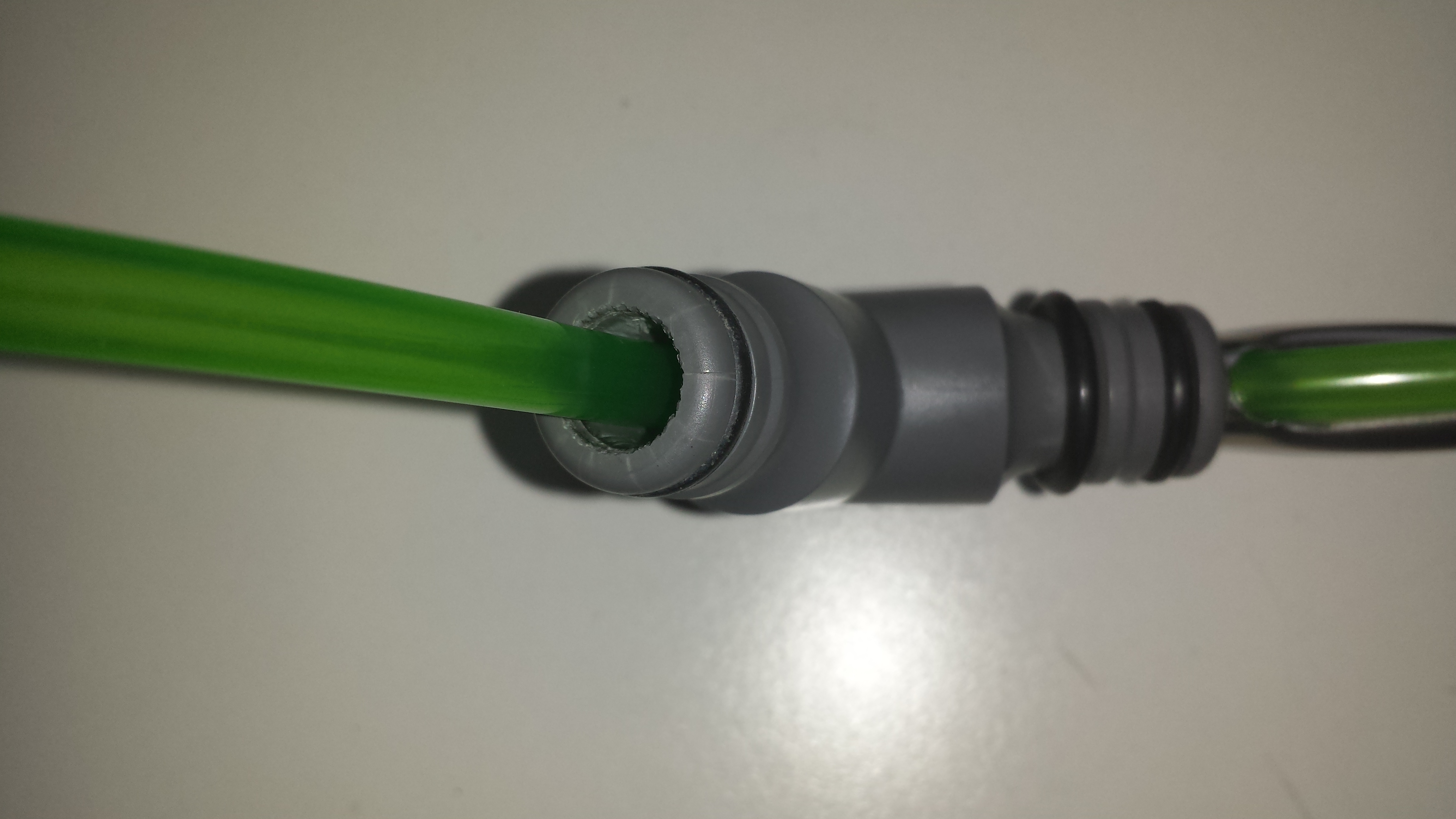 Der Schlauch geht gerade so in diese Hülse rein, und die Hülse passt grade so in den Abzweig, damit ist die Stelle dicht. Wenn man das Teil nun zum Abfüllen in die Flasche steckt, rollt es den oberen beweglichen O-Ring zwischen Flasche und dem Abzweig hoch, dadurch, dass das ein Konus ist, klemmt es den Gummi fest und es ist dicht. Je nachdem, wieweit man den grünen Schlauch nun überstehen lässt, ändert sich die Abfüllhöhe.