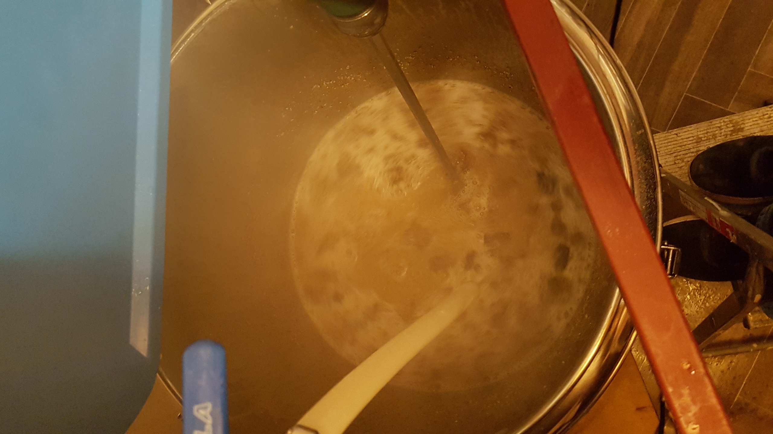 Es folgte die übliche Läuterplagerei, neu umrühren, warte, Monofilement säubern etc. Irgendwann war der ganze Schmunkes dann geschafft, die Würze konnte gekocht werden. Beim Ausschlagen dann wieder die Sauerei mit dem verstopften Filter :thumbdown
