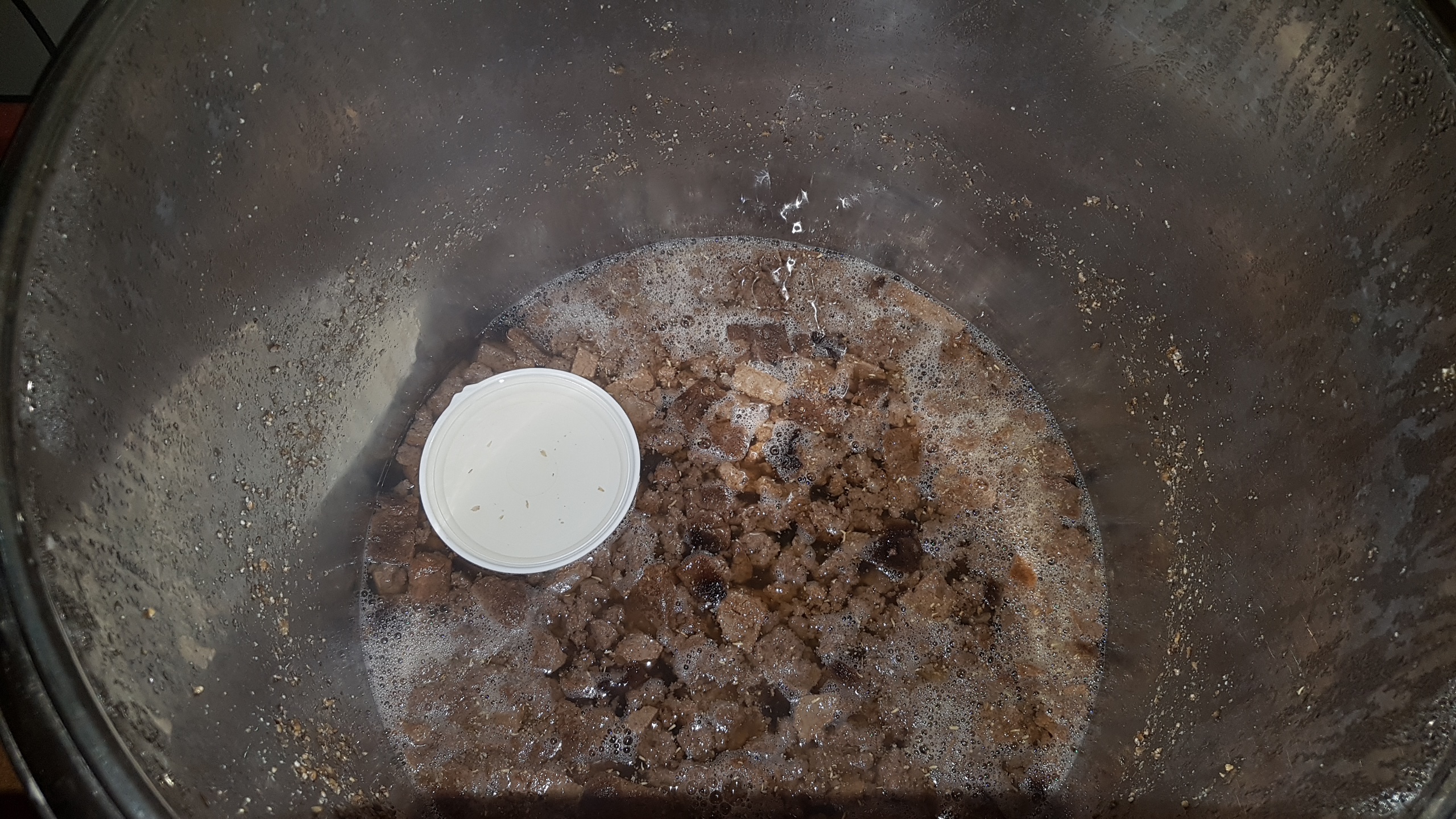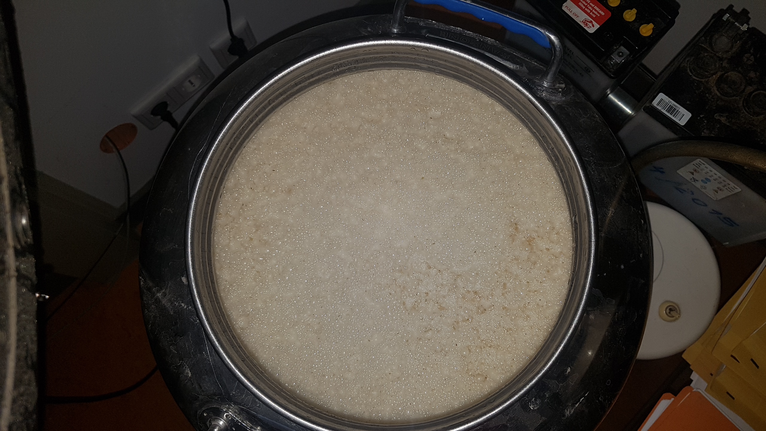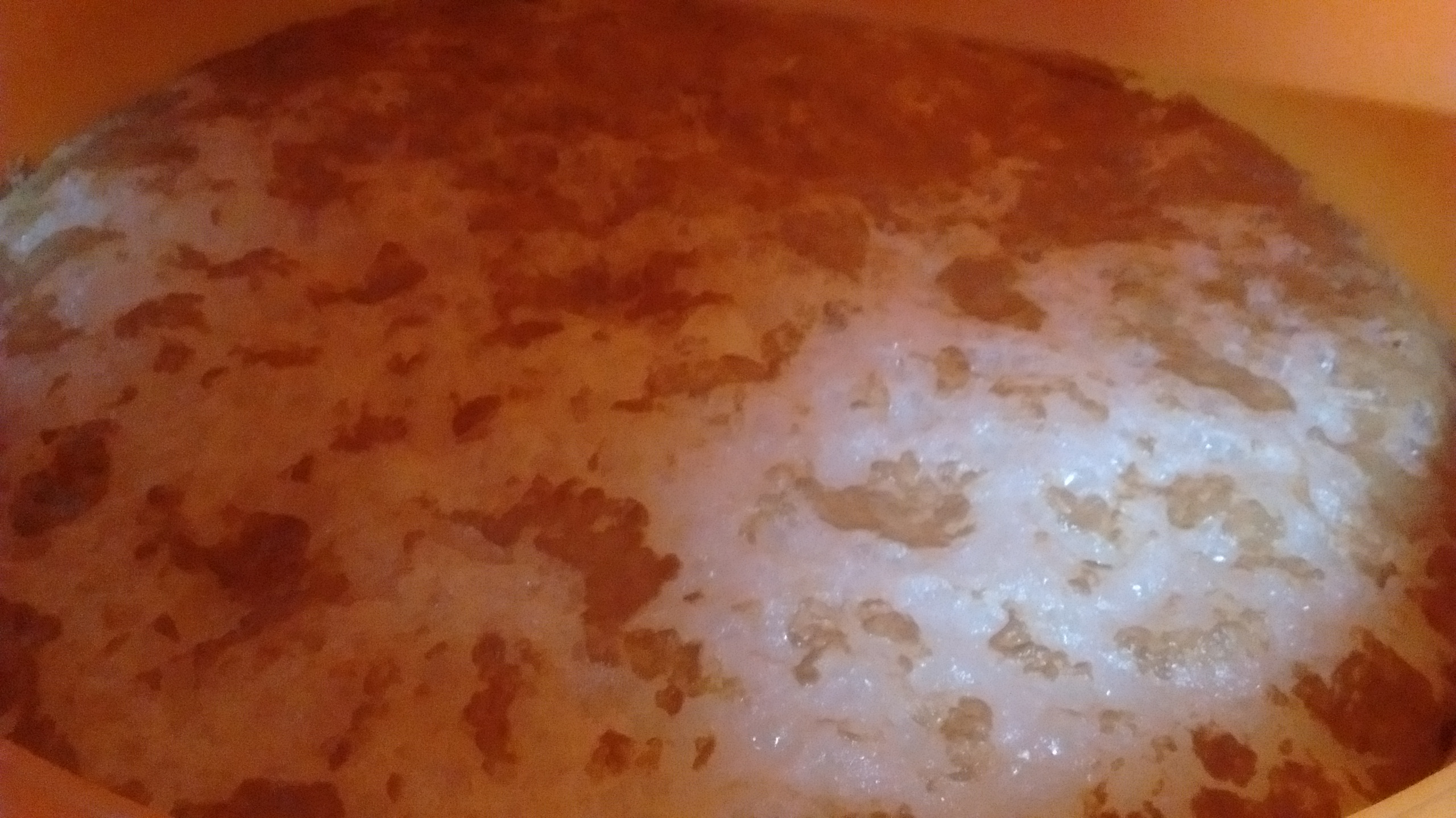 Blick in den Thermoport vorm ersten Anschwänzen. Die Brotkanten schwimmen in der Würze oben und sind deshalb auf der Malztreberschicht.