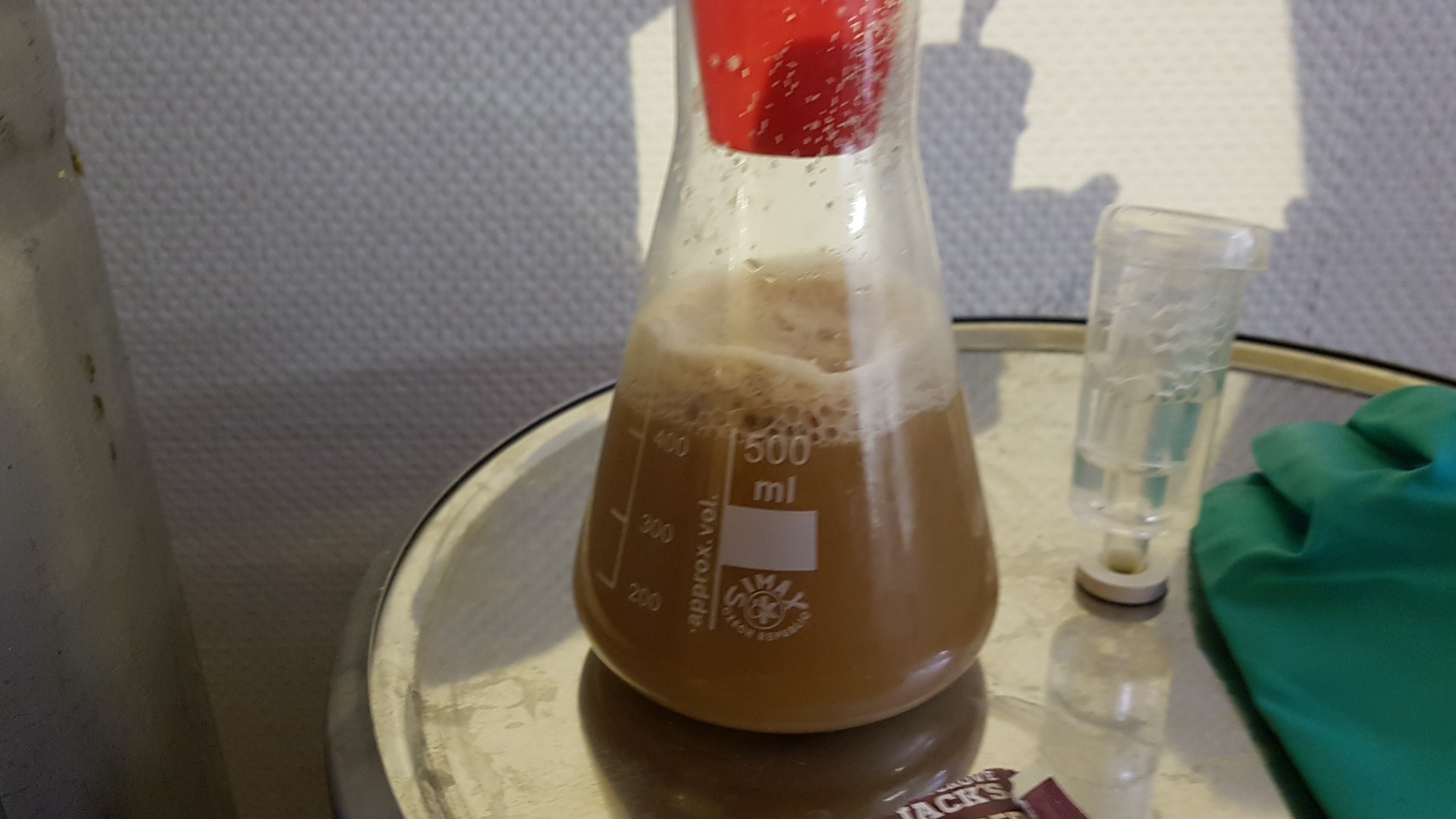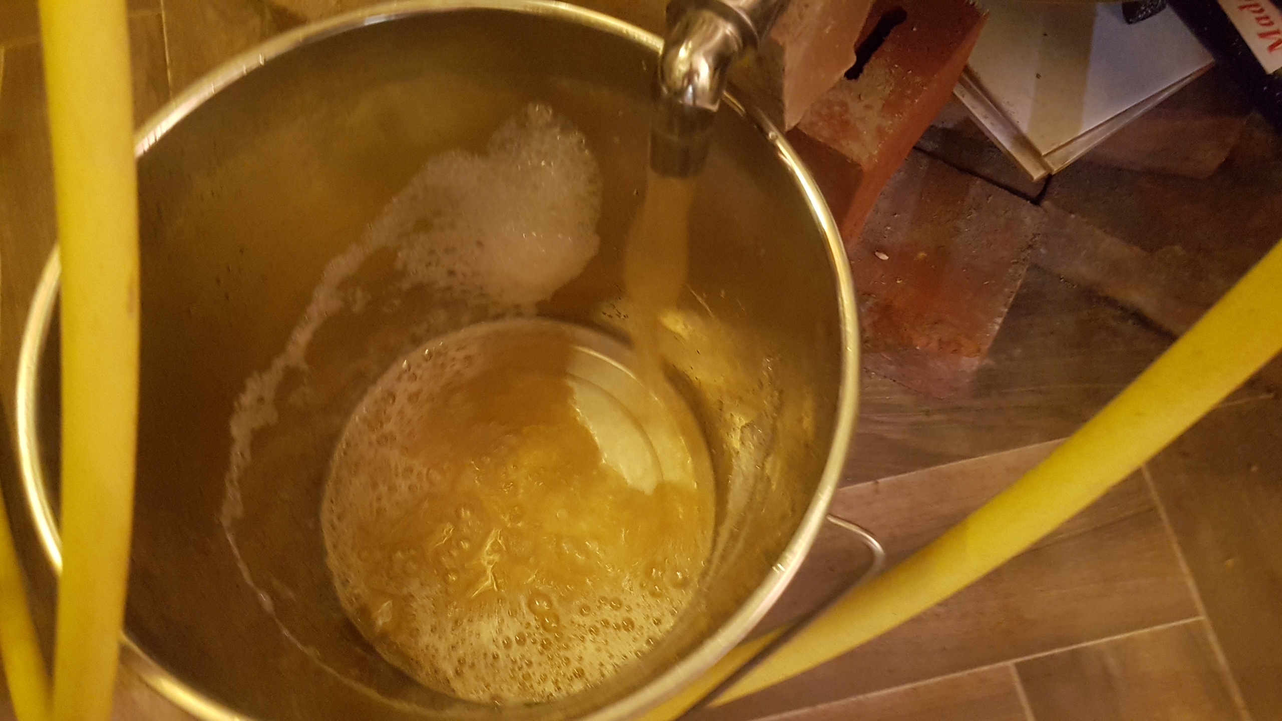 Bei 19 °C gings ab in den Edelstahleimer. Dadurch wurde gleich belüftet. Anschliesend habe ich die Würze in das Arbeitszimmer (20 °C) geschleppt, in die Edelstahlkanne gefüllt und mit der Hefe angestellt. Rausgekommen sind 25l mit 12,5°P
