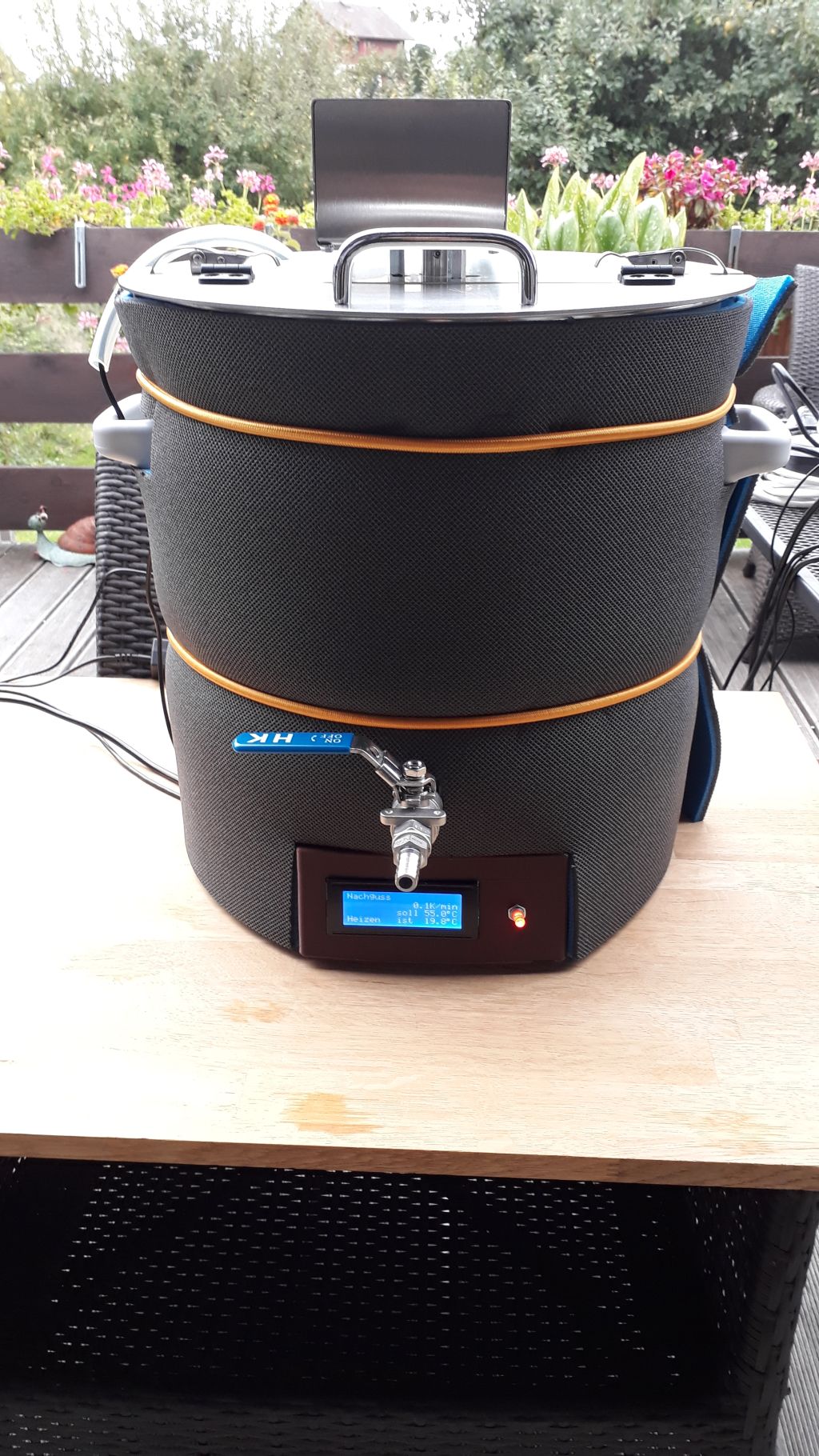 Im Rezept sind etwa 30l Nachguss vorgesehen, daher muss auch dieser Kocher frühzeitig gefüllt und die Heizung eingeschaltet werden