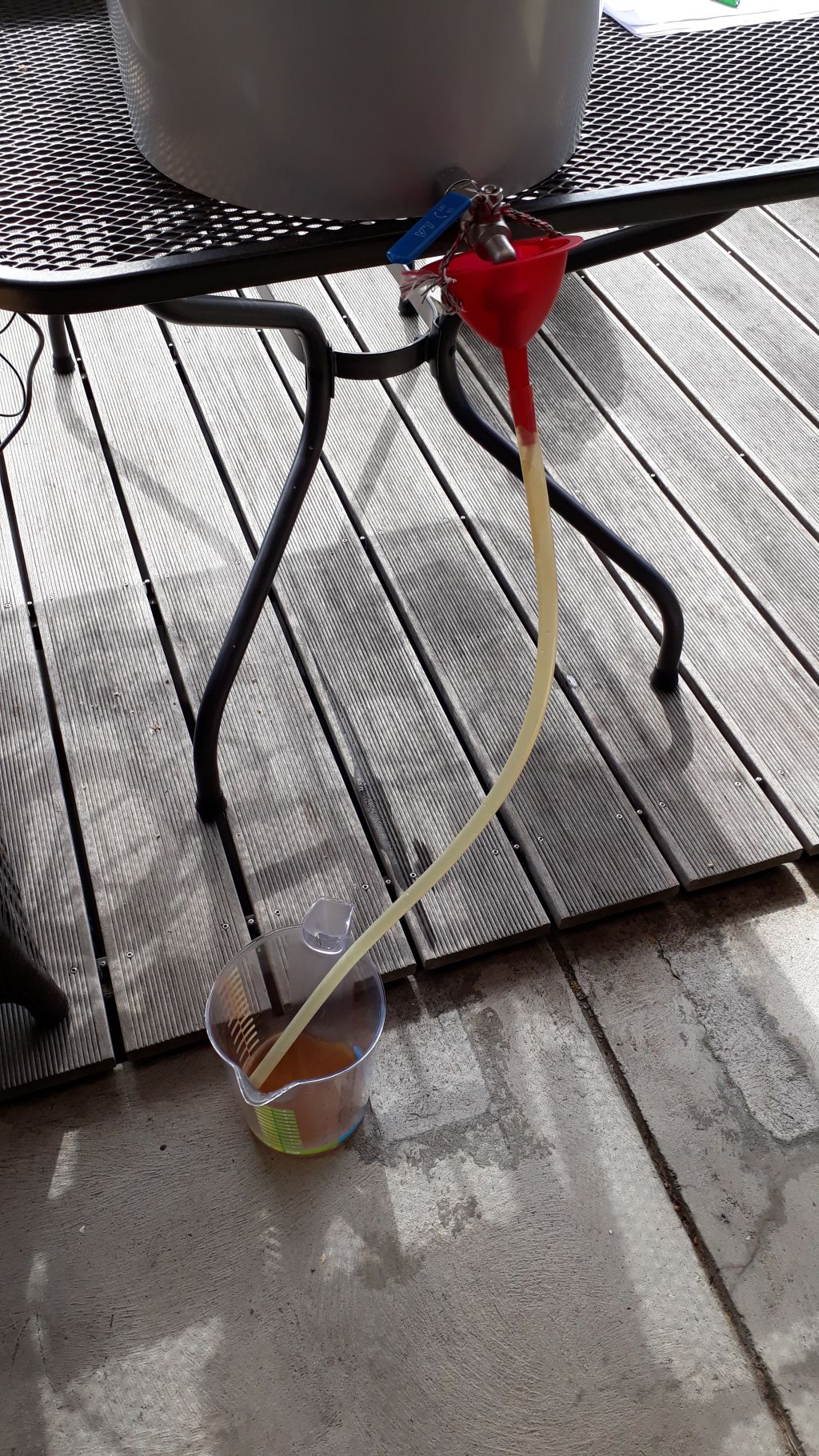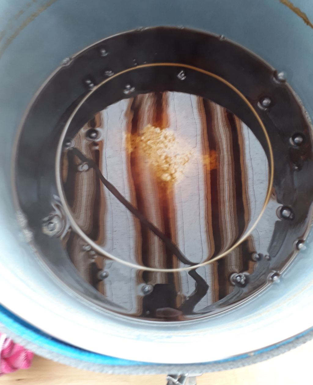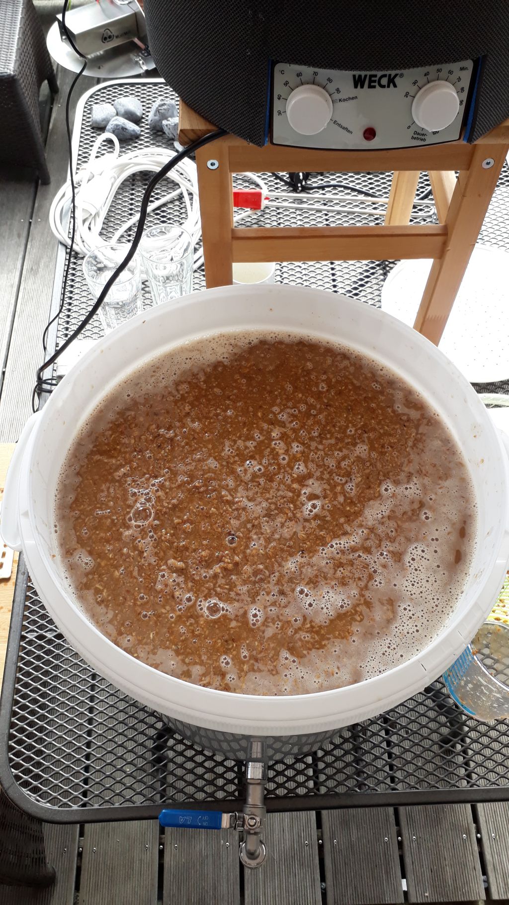Das Innere des Läutereimers: das Wasser läuft auf einen Deckel mit vielen Löchern. So werden die Treber nicht aufgewirbelt und ich kann kontinuierlich Läutern. Nebenher gibt es jeweils Mittagessen...