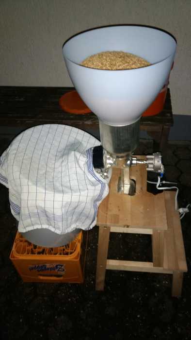 Das Malz wurde ca. 20min mit 2% Wasser konditioniert und im Porkertclone geschrotet. Der Mehlanteil war relativ groß, die Spelzen waren weitestgehend ganz. Bei Kombirast geht die Einstellung bei mir sehr gut. Wenn ich mit dem Rührwerk arbeite, stockt das Läutern, anscheinend werden die Spelzen durch das Rühren zerrieben.