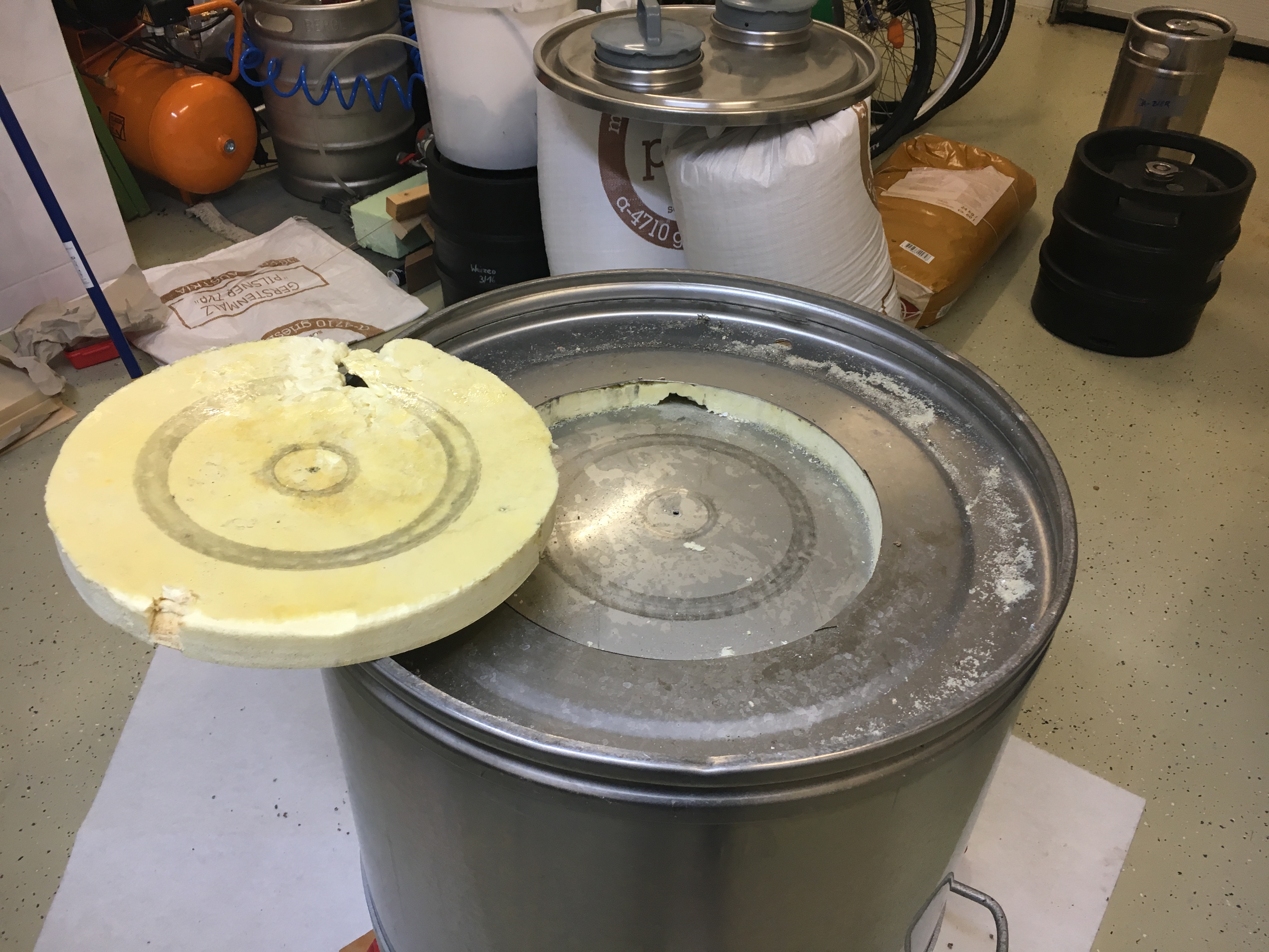 - Mit dem Mannloch warte ich noch mal ab, denn wie Du schon erkannt hast, ist das nicht so einfach. Zum einen sorge ich mich um extremen Schweißverzug, zum anderen um die umliegende Isolierung, die beim Schweißen auch flöten gehen wird. Ich hänge vorerst eine Kette von der Decke, an die ich über/im Läuterbottich einen Eimer hännge. So kann ich ganz entspannt und beidhändig schaufeln...