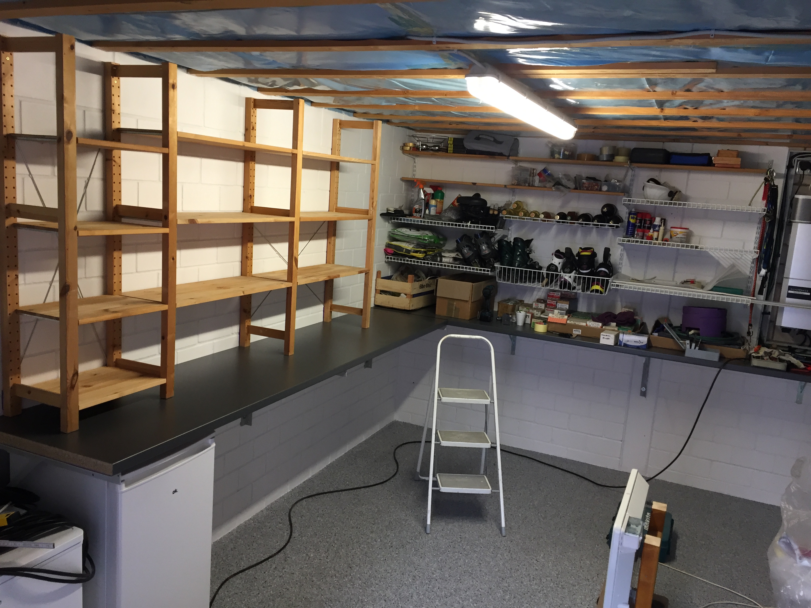 Der Boden war noch ein Zement-Esterich Boden und wurde mit einem Industrieboden aus dem Lebensmittelbereich vergossen. Der Boden ist extrem belastbar und zeigt selbst nach "Rutschpartien" mit schweren Gegenständen keine Kratzer auf.