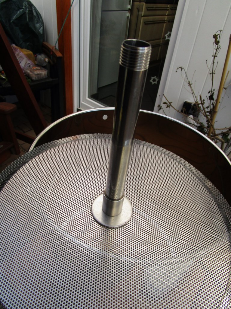 Als erstes habe ich die Verschraubung vom Überlaufrohr in das untere Malzsieb verstärkt. Dazu habe ich einfach 2 VA-Scheeben auf 22 mm aufgebohrt und mit dem Überlauf verschraubt. Das Rohr steht so deutlich stabiler.