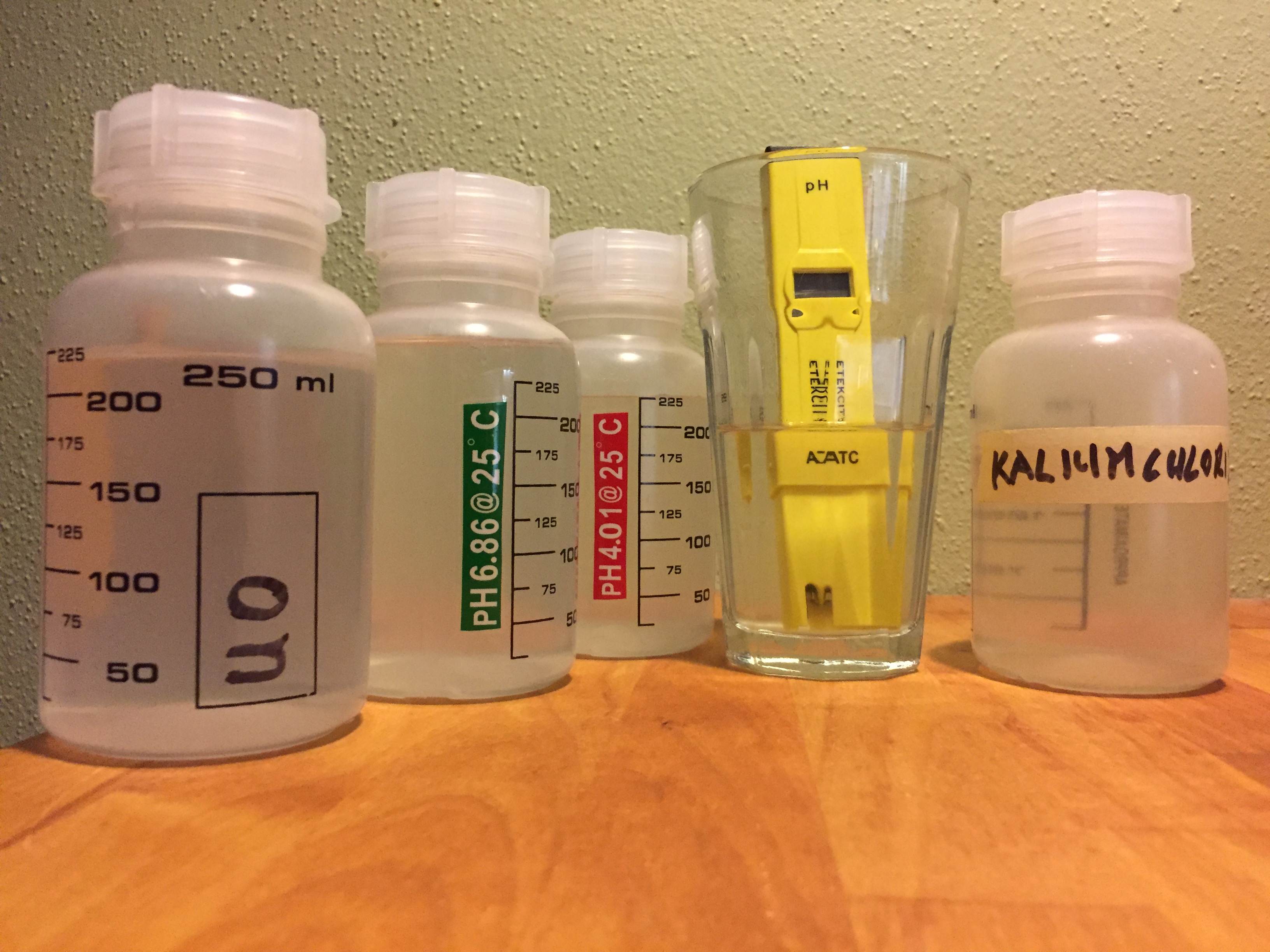 Zu deinem pH-Messgerät benötigst Du noch die Kalibrierlösungen. Meine bewahre ich in den auf dem Foto gezeigten 250ml Weithalsflaschen auf.