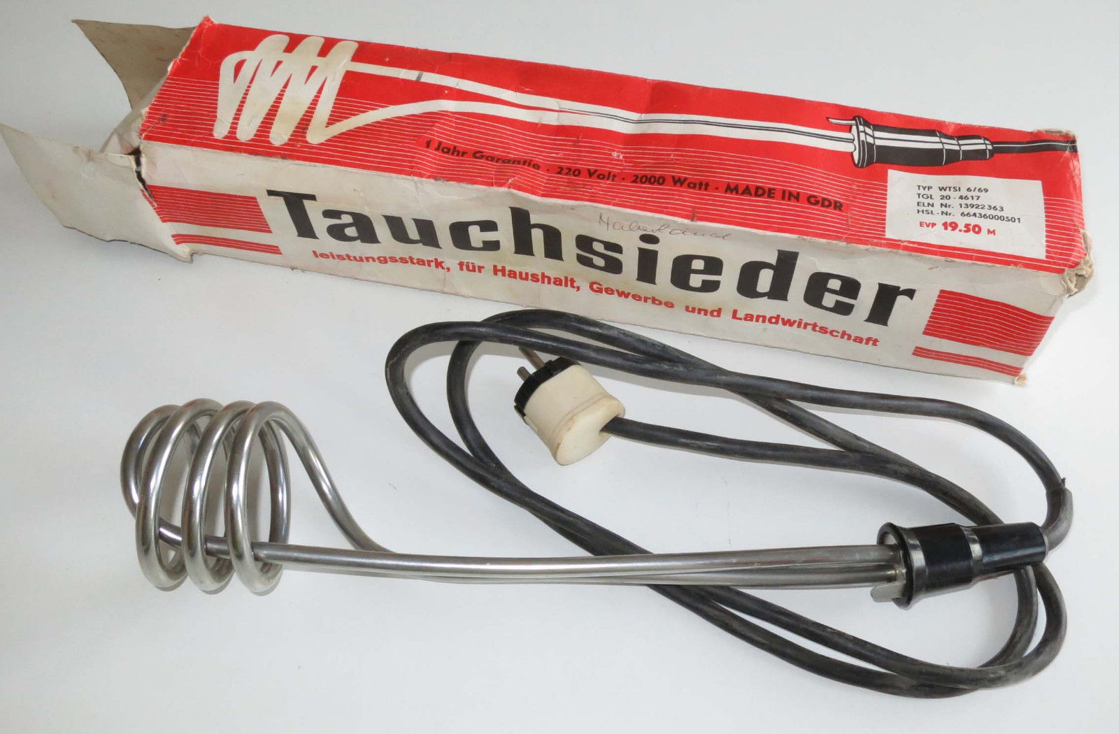 Ich habe mal ein Bündel von 3 DDR-Tauchsiedern gekauft (ich glaube für 14 EUR). Die versiegelten Stecker und Sieder (auf Ruthards Bildern auf dem unteren) sind zu bevorzugen.